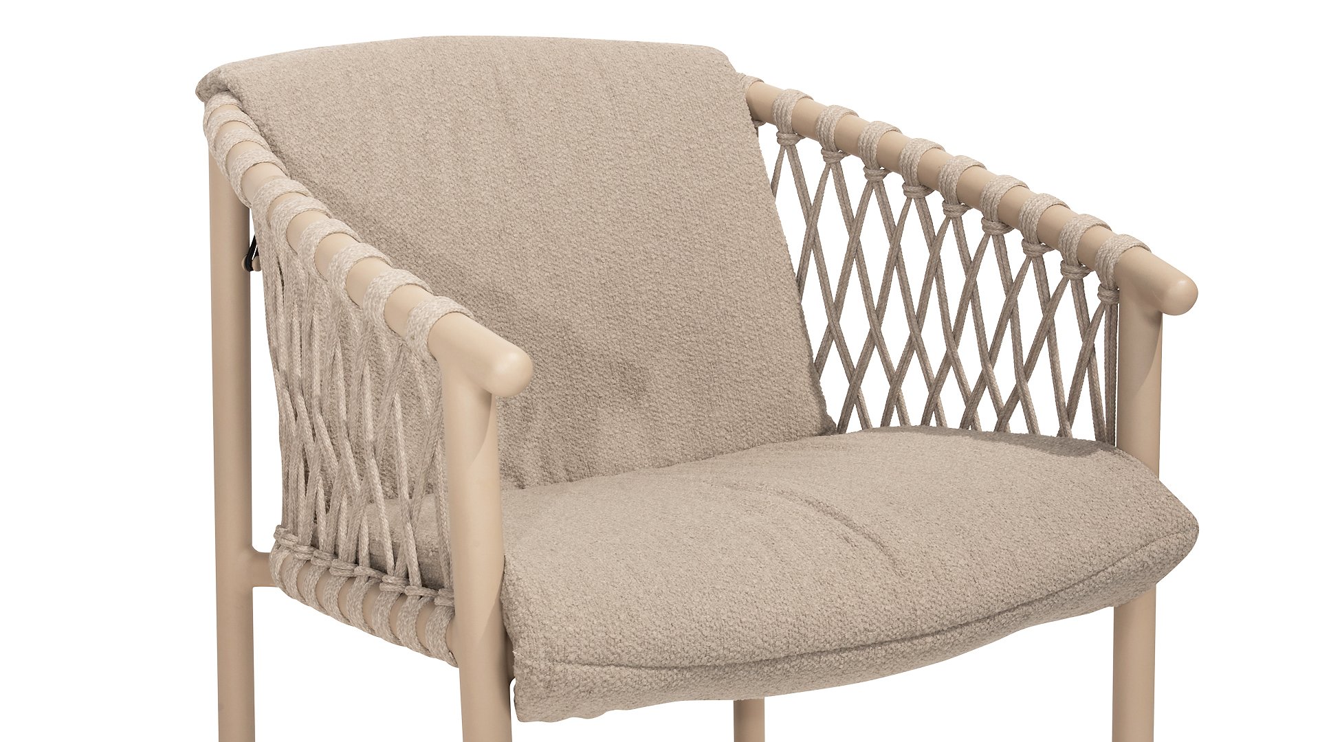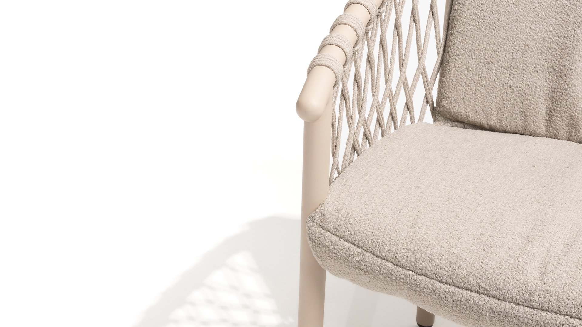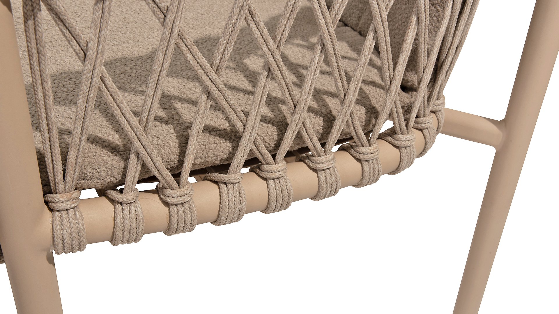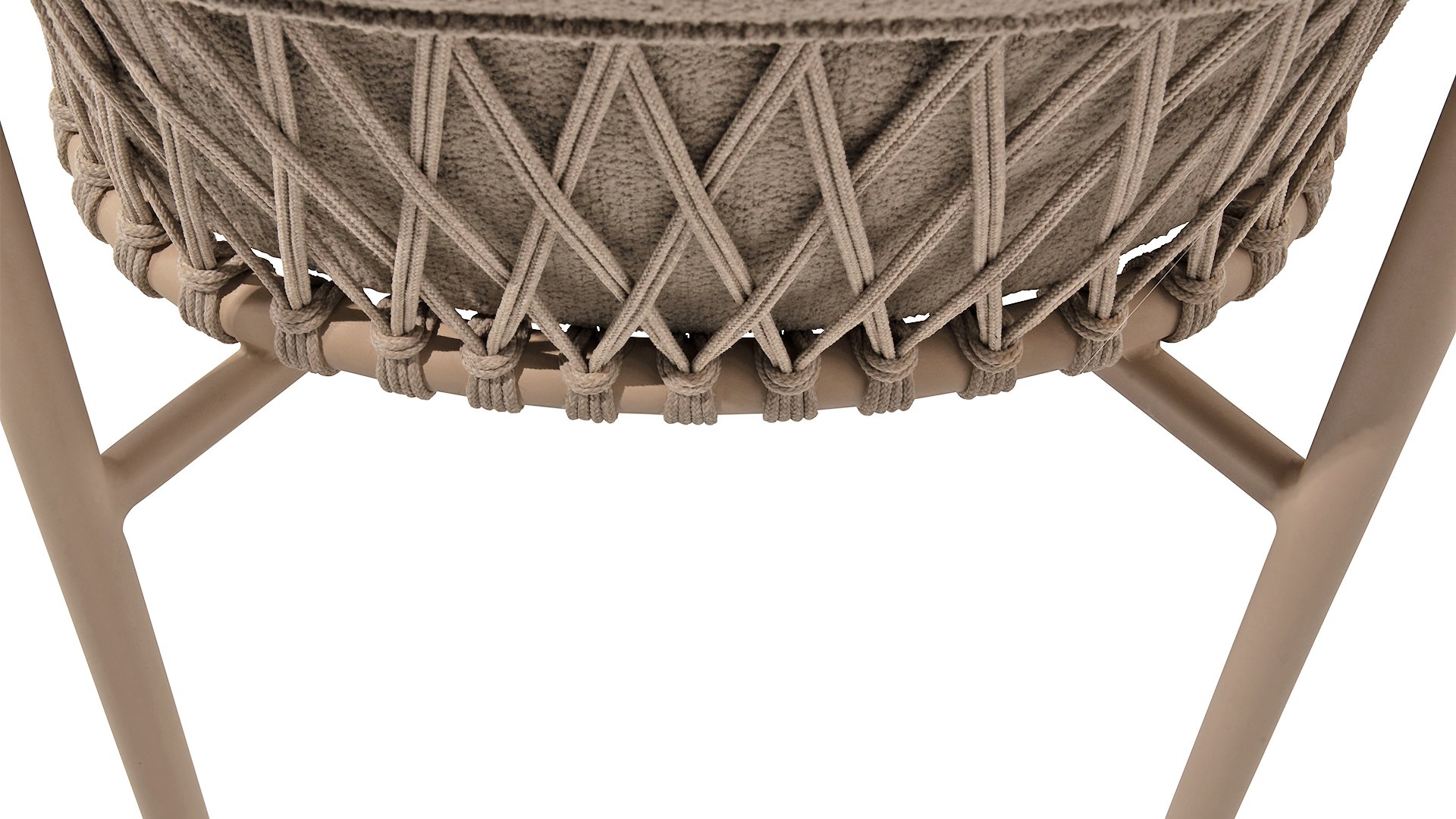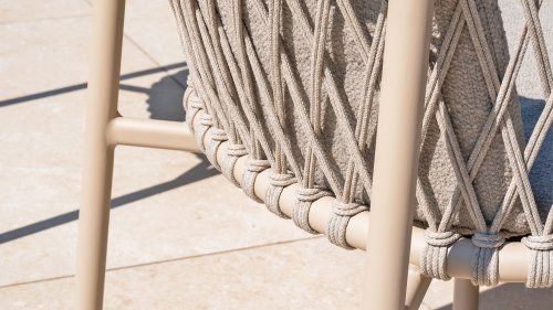 The 4SO Allora chair is a stylish and comfortable choice for both indoor and outdoor use, with a modern look that fits various garden settings. The chair is available in two variants: Latte and Terre. The Allora chair is made from rope wire and powder-coated aluminum, providing both durability and a light, modern appearance. The use of rope wire makes the chair playful and breathable. The powder-coated aluminum frame offers extra protection against weather elements and makes the chair low maintenance and lightweight.