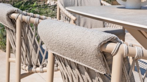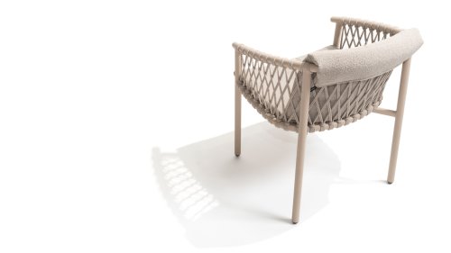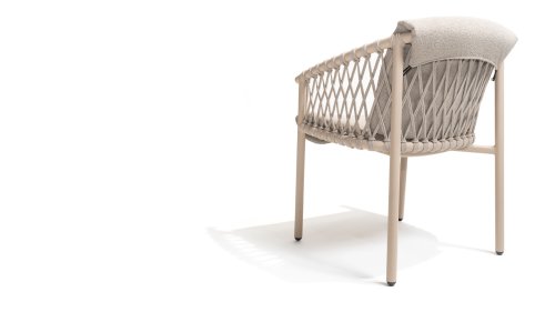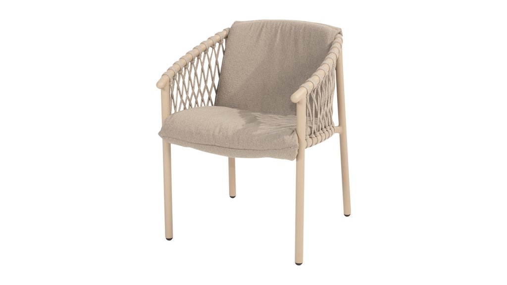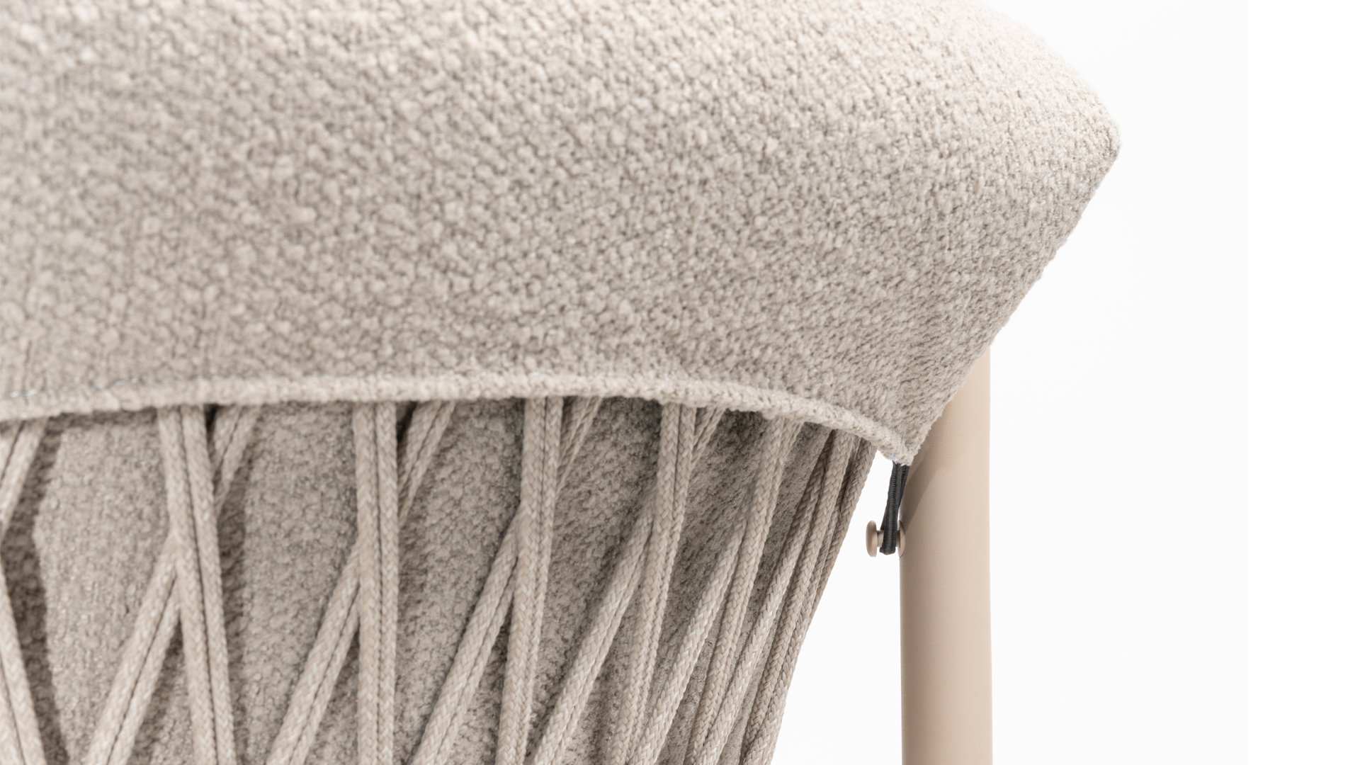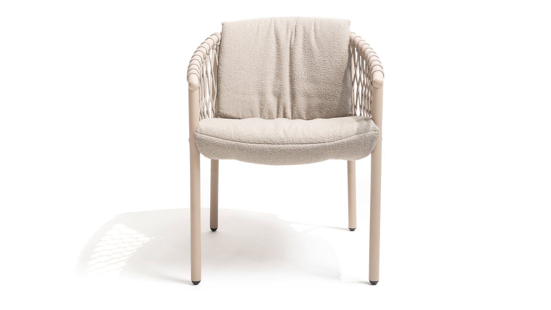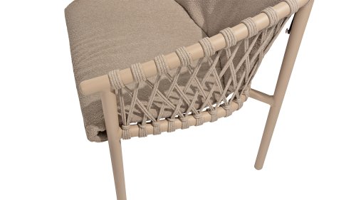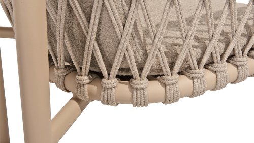 The 4SO Allora chair is a stylish and comfortable choice for both indoor and outdoor use, with a modern look that fits various garden settings. The chair is available in two variants: Latte and Terre. The Allora chair is made from rope wire and powder-coated aluminum, providing both durability and a light, modern appearance. The use of rope wire makes the chair playful and breathable. The powder-coated aluminum frame offers extra protection against weather elements and makes the chair low maintenance and lightweight.