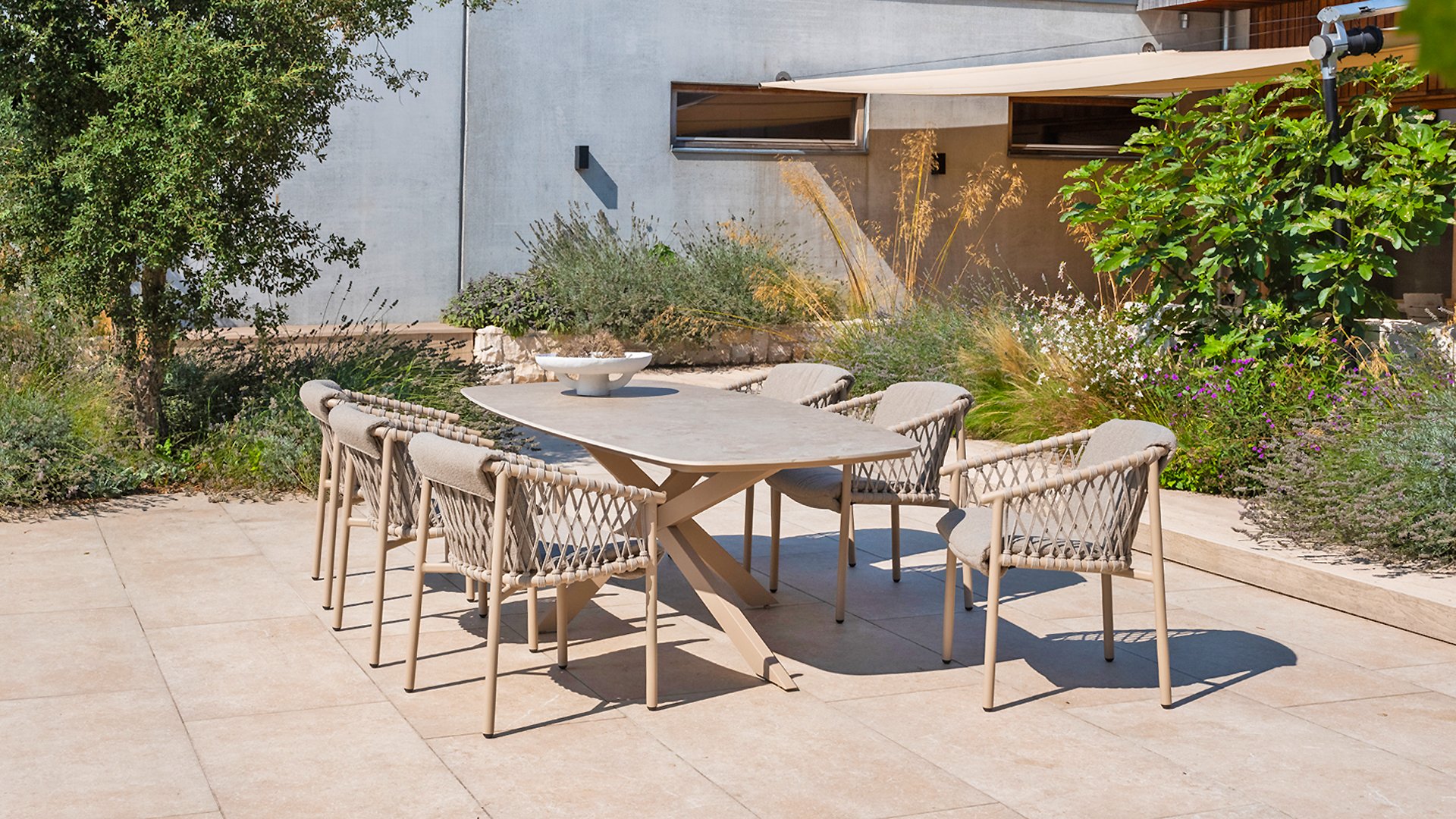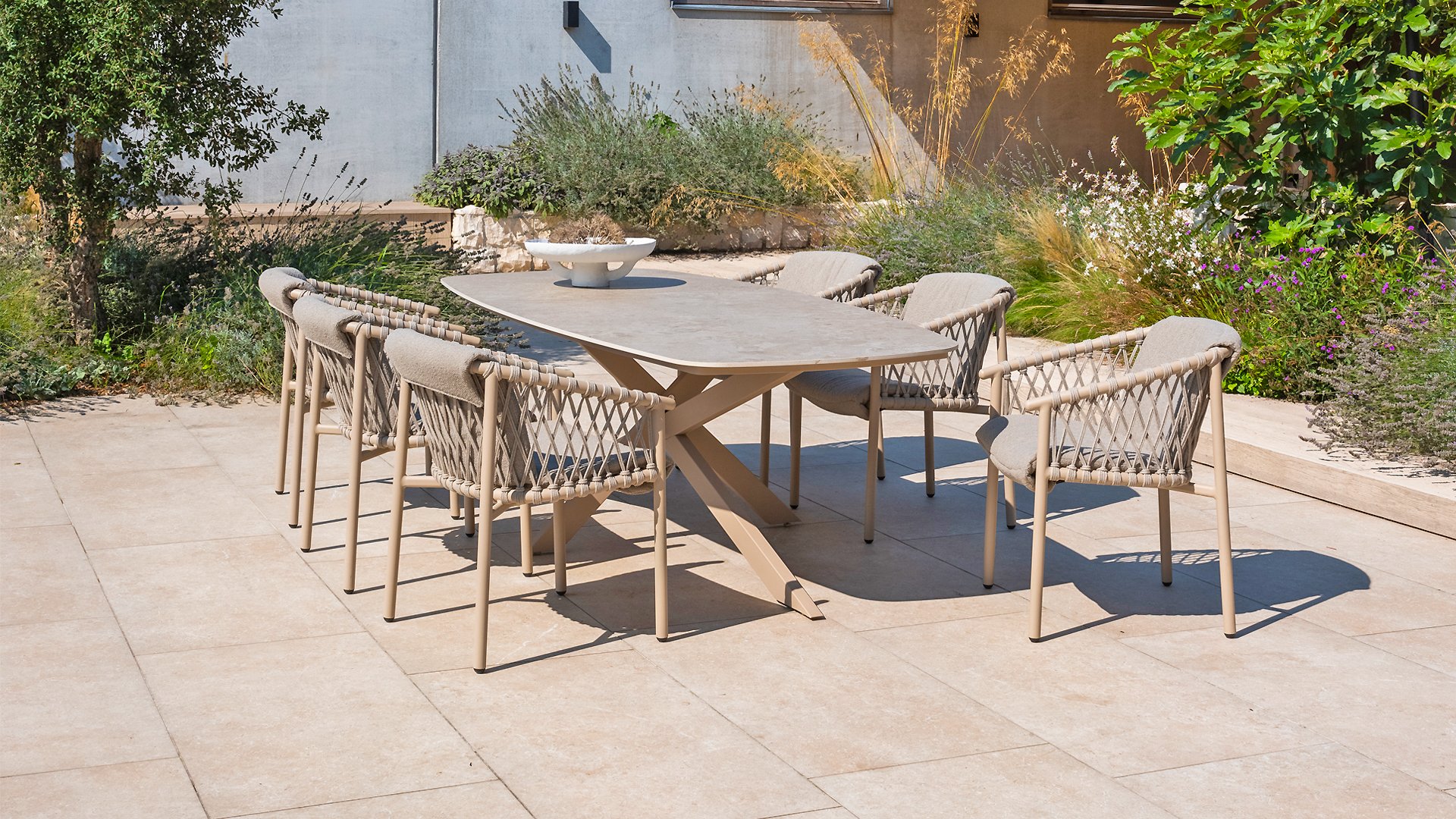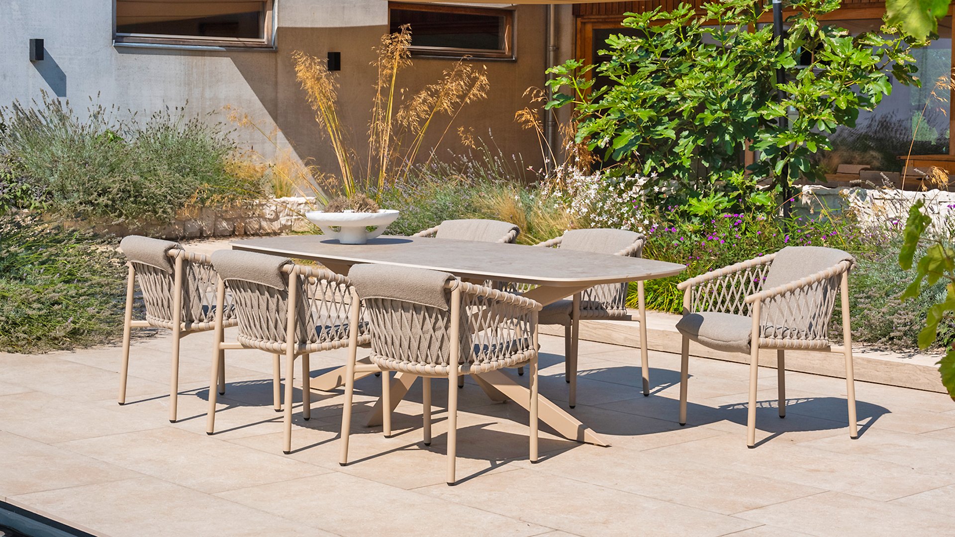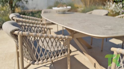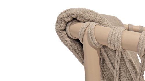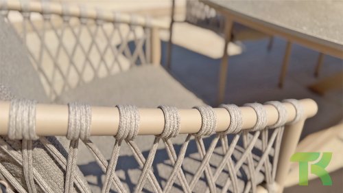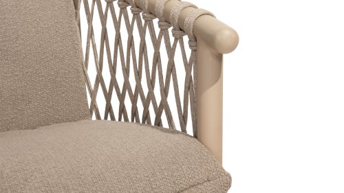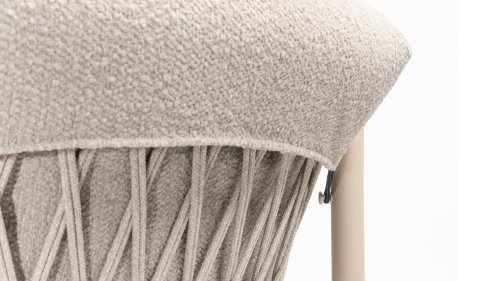 The 4SO Allora chair is a stylish and comfortable choice for both indoor and outdoor use, with a modern look that fits various garden settings. The chair is available in two variants: Latte and Terre. The Allora chair is made from rope wire and powder-coated aluminum, providing both durability and a light, modern appearance. The use of rope wire makes the chair playful and breathable. The powder-coated aluminum frame offers extra protection against weather elements and makes the chair low maintenance and lightweight.