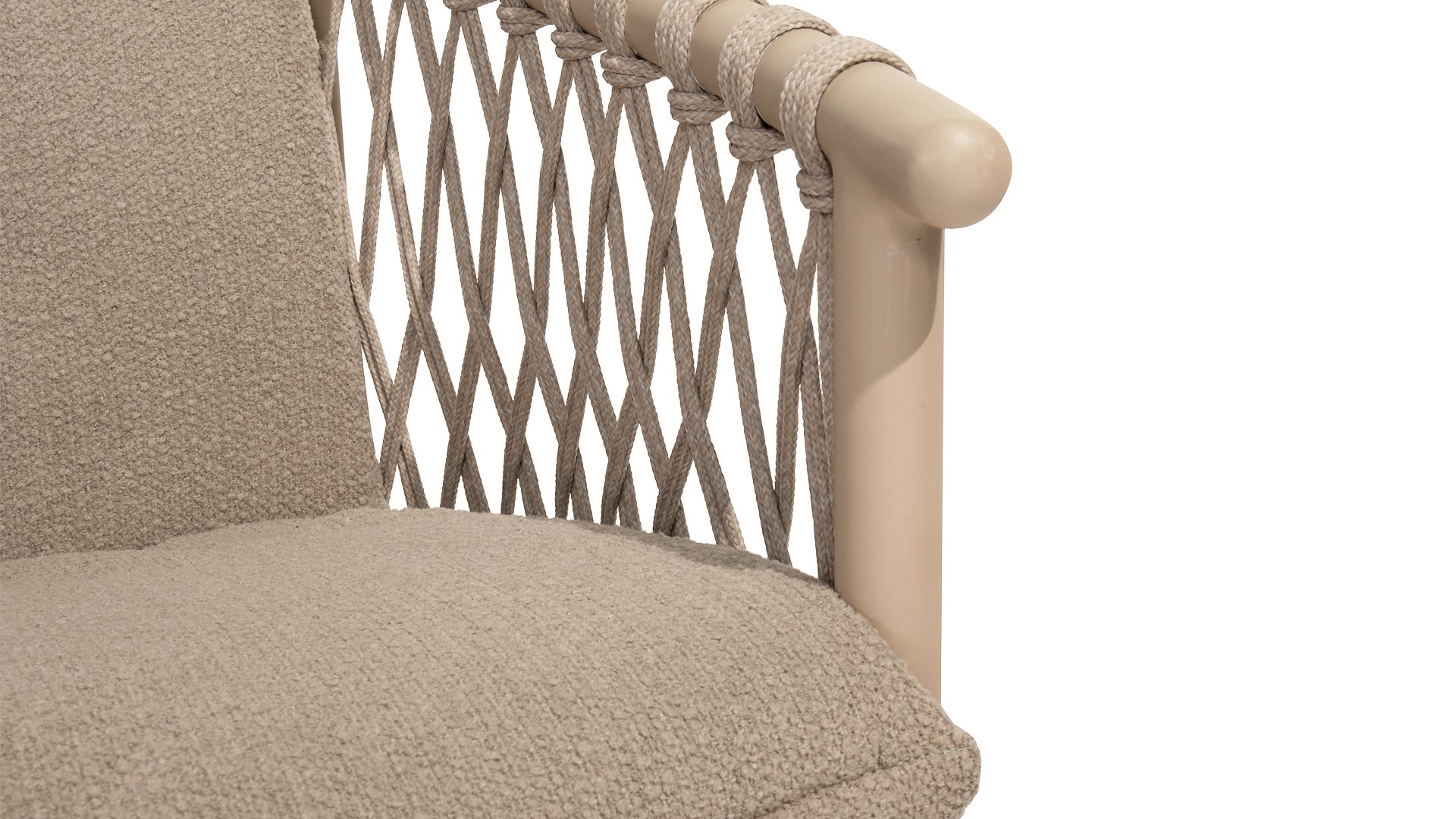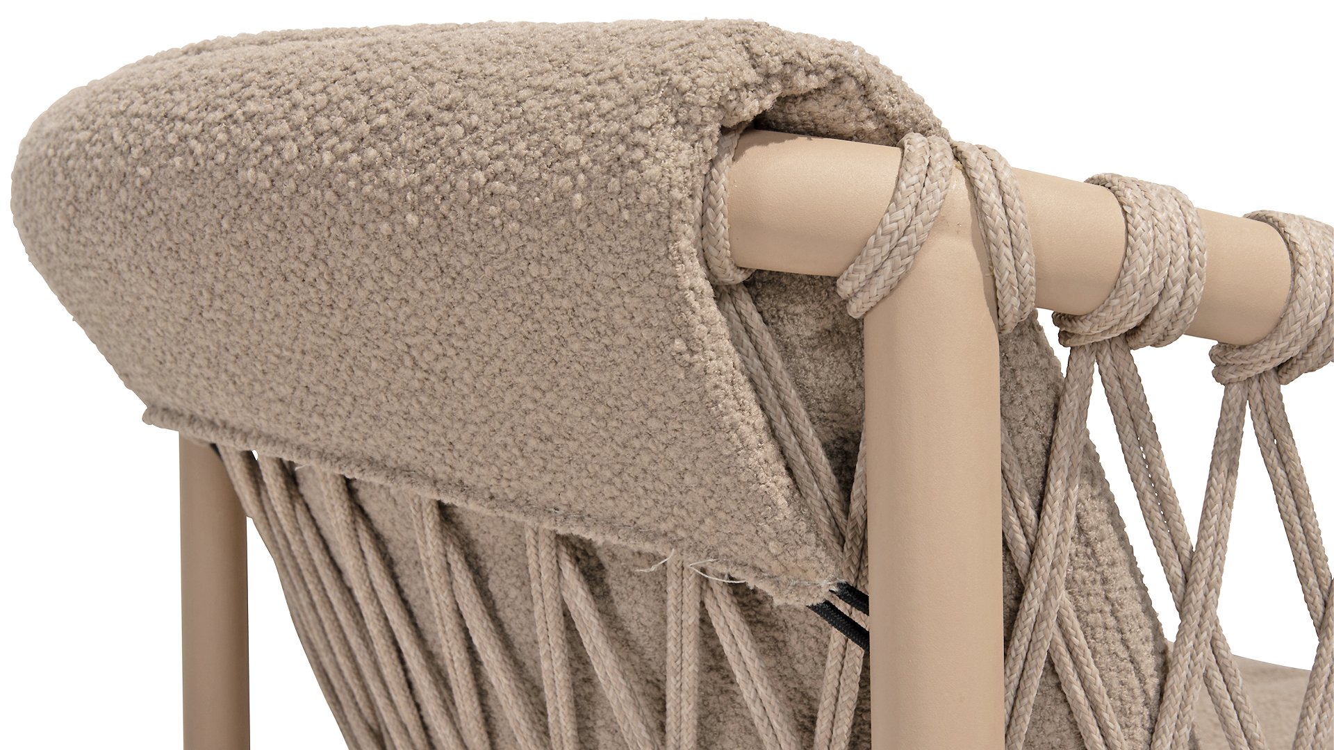 The fabric of the seat is made of Olefin, a synthetic material known for its strength and weather resistance. The Bouclé Clay upholstery adds a luxurious and soft texture that is both aesthetically pleasing and practical.