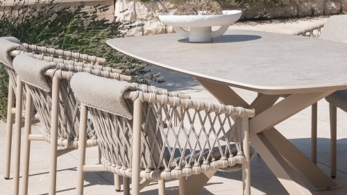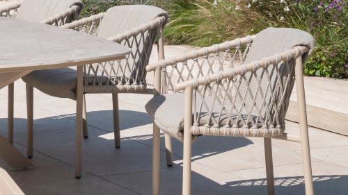 The 4SO Allora chair is a stylish and comfortable choice for both indoor and outdoor use, featuring a modern look that fits various garden settings. The chair is available in two variants: Latte and Terre. The Allora chair is made from rope wire and powder-coated aluminum, ensuring both durability and a light, modern appearance. The use of rope wire makes the chair playful and breathable. The powder-coated aluminum frame offers extra protection against weather elements, making the chair low-maintenance and lightweight.