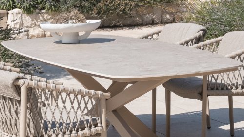 A beautiful, elegant table with a stunning oval ceramic top, available in either 240cm or 300cm. The top not only exudes refinement but also has a striking, modern look. The striking cross leg is available in three colors, allowing you to effortlessly tailor this table to your needs and preferences. Whether you choose industrial black, warm latte, or chic terre, each color adds a unique character and a touch of luxury to the table.