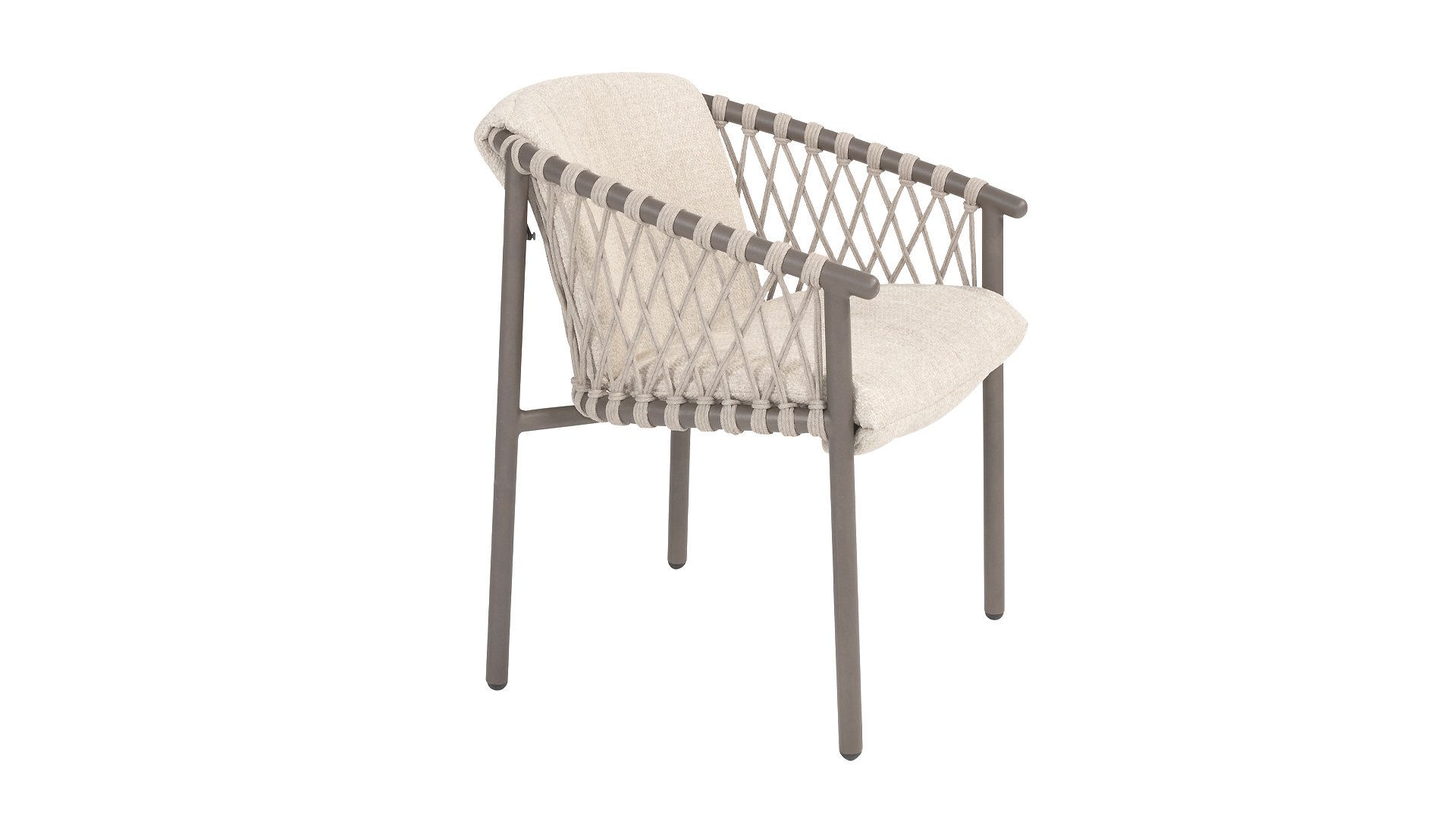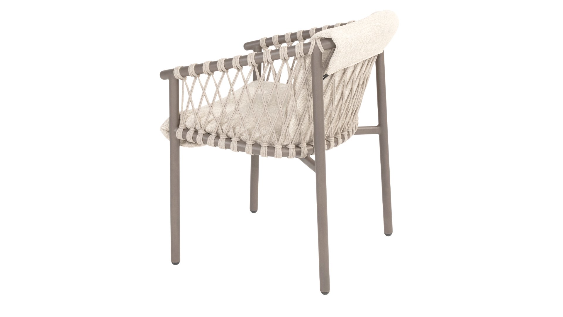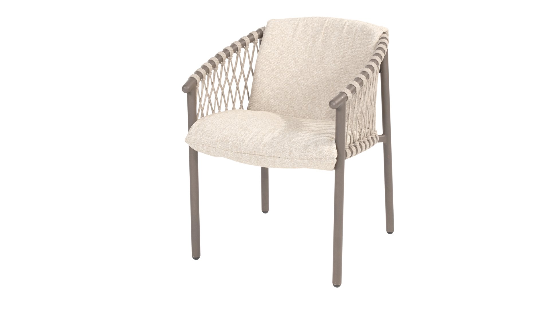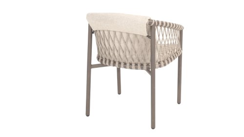 The 4SO Allora chair is a stylish and comfortable choice for both indoor and outdoor use, featuring a modern look that fits various garden settings. The chair is available in two variants: Latte and Terre. The Allora chair is made from rope wire and powder-coated aluminum, ensuring both durability and a light, modern appearance. The use of rope wire makes the chair playful and breathable. The powder-coated aluminum frame offers extra protection against weather elements, making the chair low-maintenance and lightweight. The fabric of the seat is made from Olefin, a synthetic material known for its strength and weather resistance. The Bouclé Clay upholstery adds a luxurious and soft texture that is both aesthetically pleasing and practical. The Allora series also includes a lounge set: 4 Seasons Outdoor Allora Lounge Set, to complete the whole look!