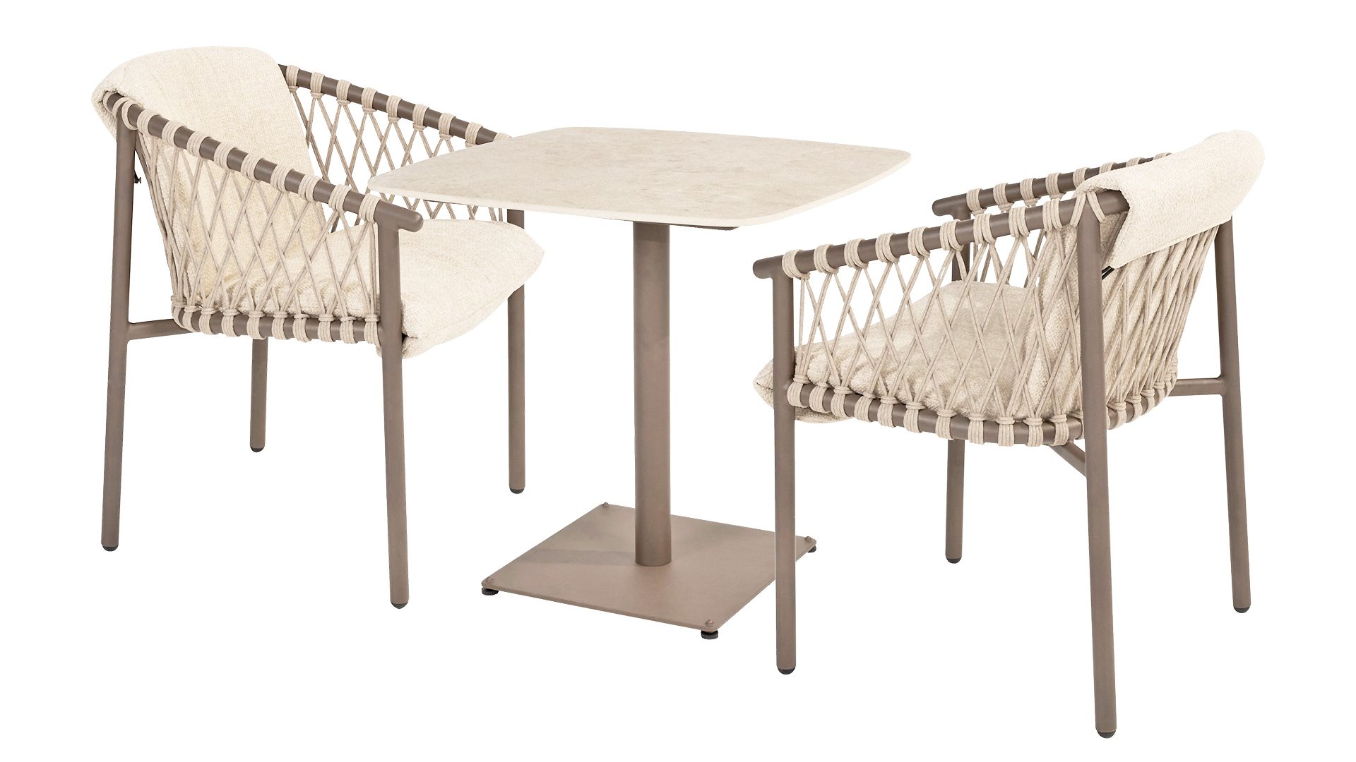 This table of 75x75 cm features an elegant ceramic top that is both stylish and practical. The ceramic is not only durable and easy to clean, but also provides a luxurious appearance. The base is in a warm, earthy shade called terre, which perfectly matches modern and rustic interiors/gardens.