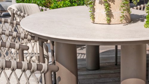This round table has an impressive diameter of Ø160 cm, making it perfect for social gatherings or family dinners. The ceramic top not only provides an elegant appearance but is also durable and easy to clean, making it ideal for everyday use. The brown-colored base, consisting of three legs that go straight down, ensures a stable and sturdy foundation. The combination of the sleek, modern design and the warm color of the base makes the table suitable for various interior styles, from industrial to cozy and homely. Also available in another size: 4 Seasons Outdoor Arizona 240x120cm.