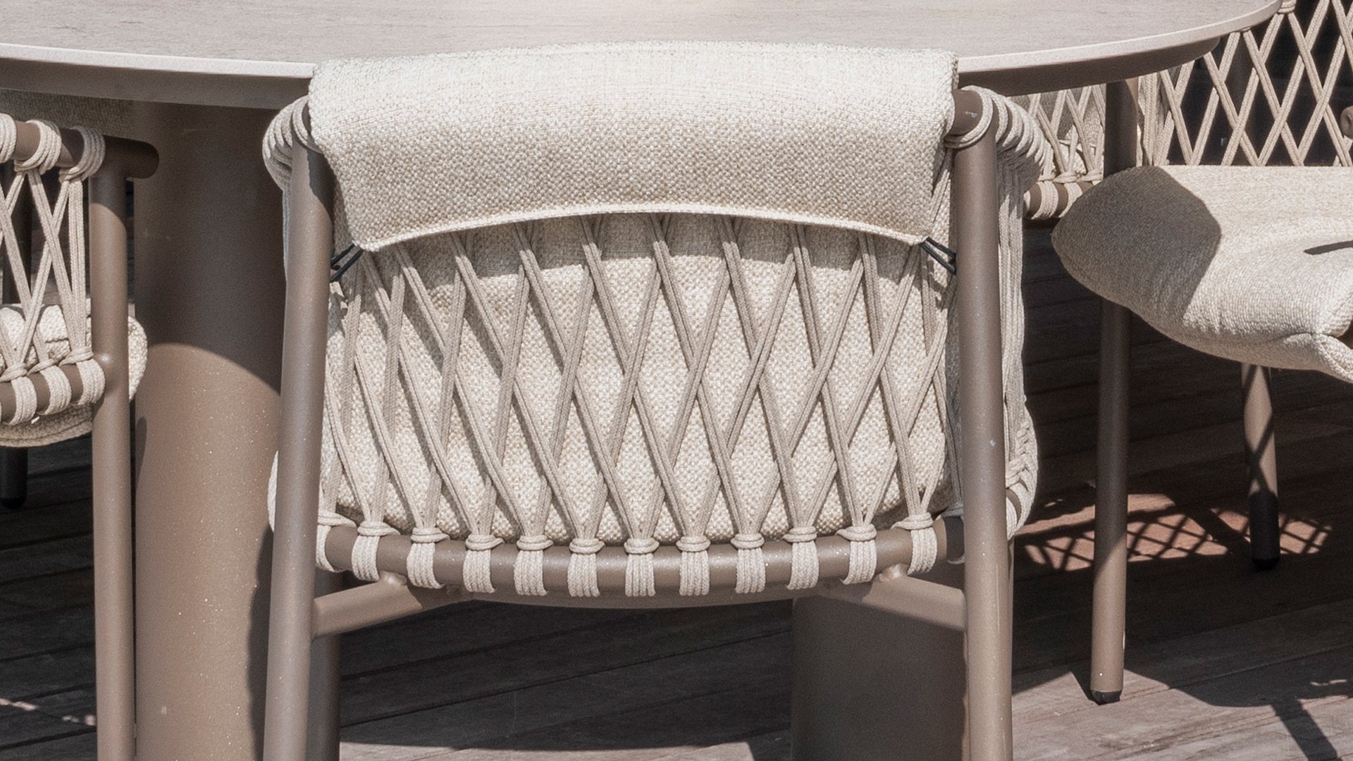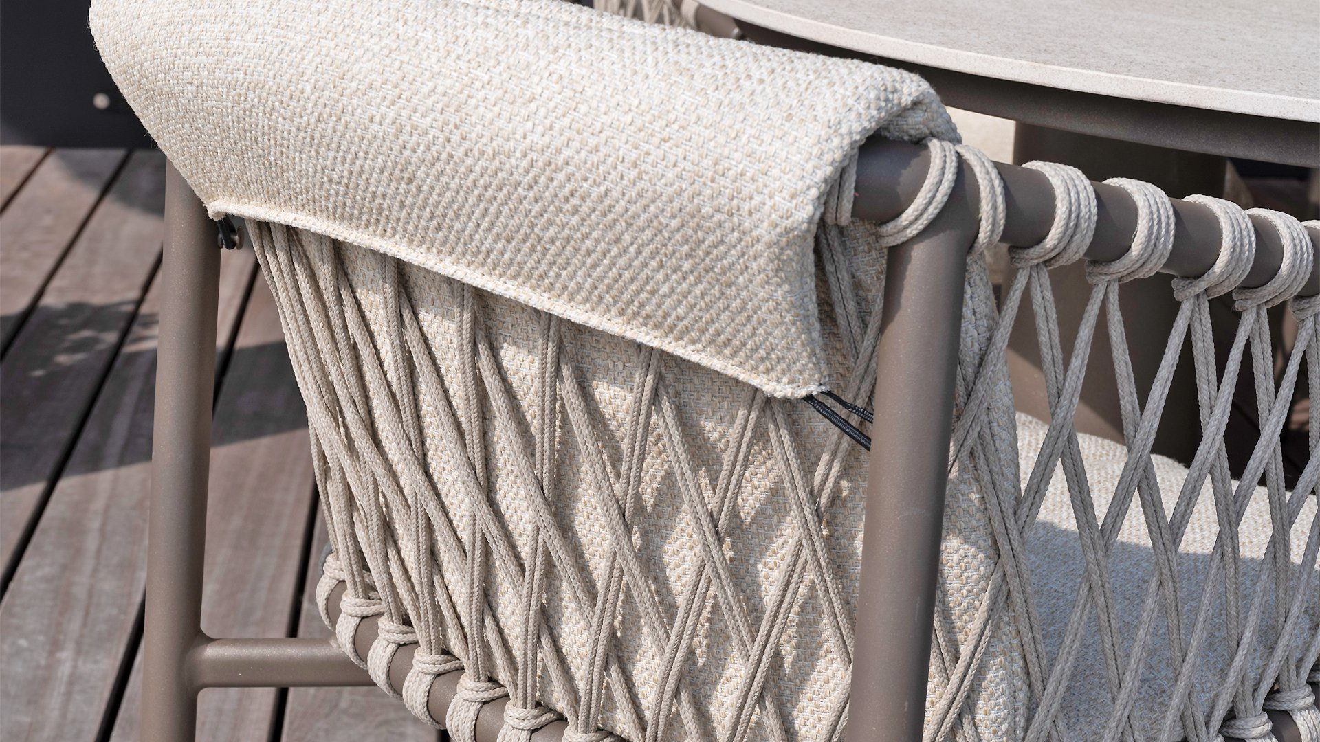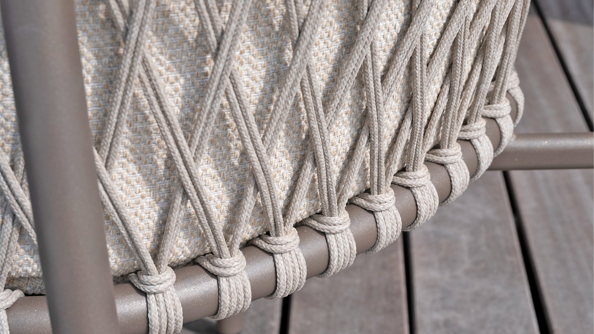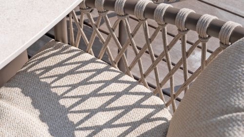 This beautiful material is perfect for outdoor use, because Taste Rope isn't just any shoelace. Taste uses very high-quality rope made from 100% SDP (Solution Dyed Polypropylene). This material is extremely strong and has very little stretch. Polypropylene is oil-based, making it virtually impermeable to dirt and contaminants, just like our cushions. Taste offers exclusive designs using hand-woven rope patterns and techniques.
