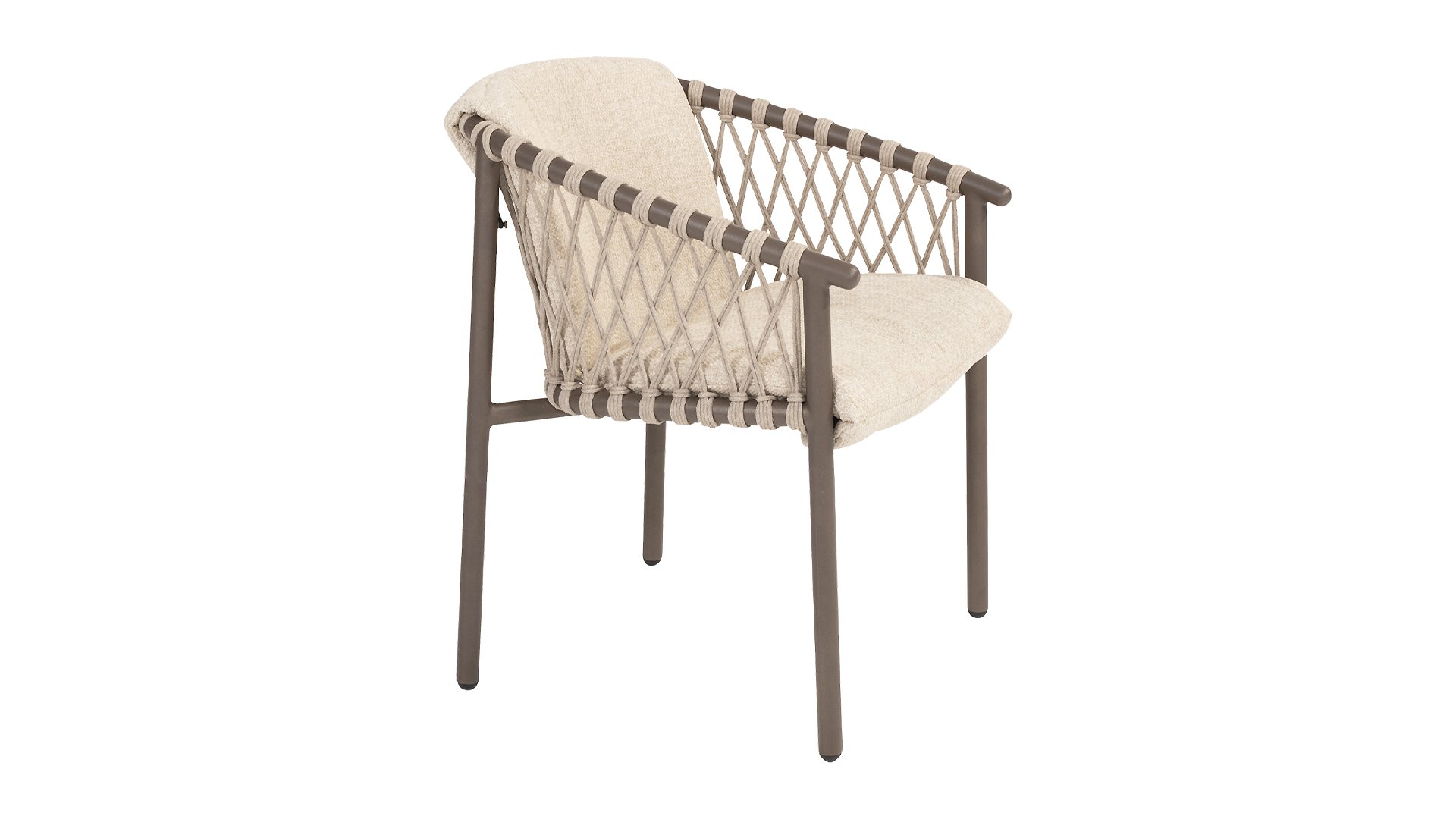 The 4SO Allora chair is a stylish and comfortable choice for both indoor and outdoor use, featuring a modern look that fits various garden settings. The chair is available in two variants: Latte and Terre. The Allora chair is made from rope wire and powder-coated aluminum, ensuring both durability and a light, modern appearance. The use of rope wire makes the chair playful and breathable. The powder-coated aluminum frame offers extra protection against weather elements, making the chair low-maintenance and lightweight. The fabric of the seat is made from Olefin, a synthetic material known for its strength and weather resistance. The Bouclé Clay upholstery adds a luxurious and soft texture that is both aesthetically pleasing and practical. The Allora series also includes a lounge set: 4 Seasons Outdoor Allora Lounge Set, to complete the whole look!