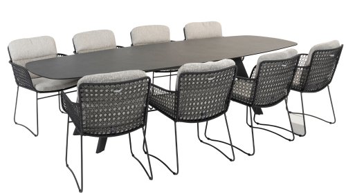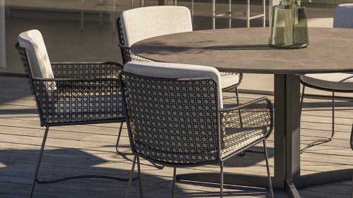 Discover the elegance and durability of the 4 Seasons Outdoor Aprilla dining chair in stylish anthracite. This chair comes with cushions and features a beautiful pattern of anthracite wickerwork and an anthracite stainless steel frame.