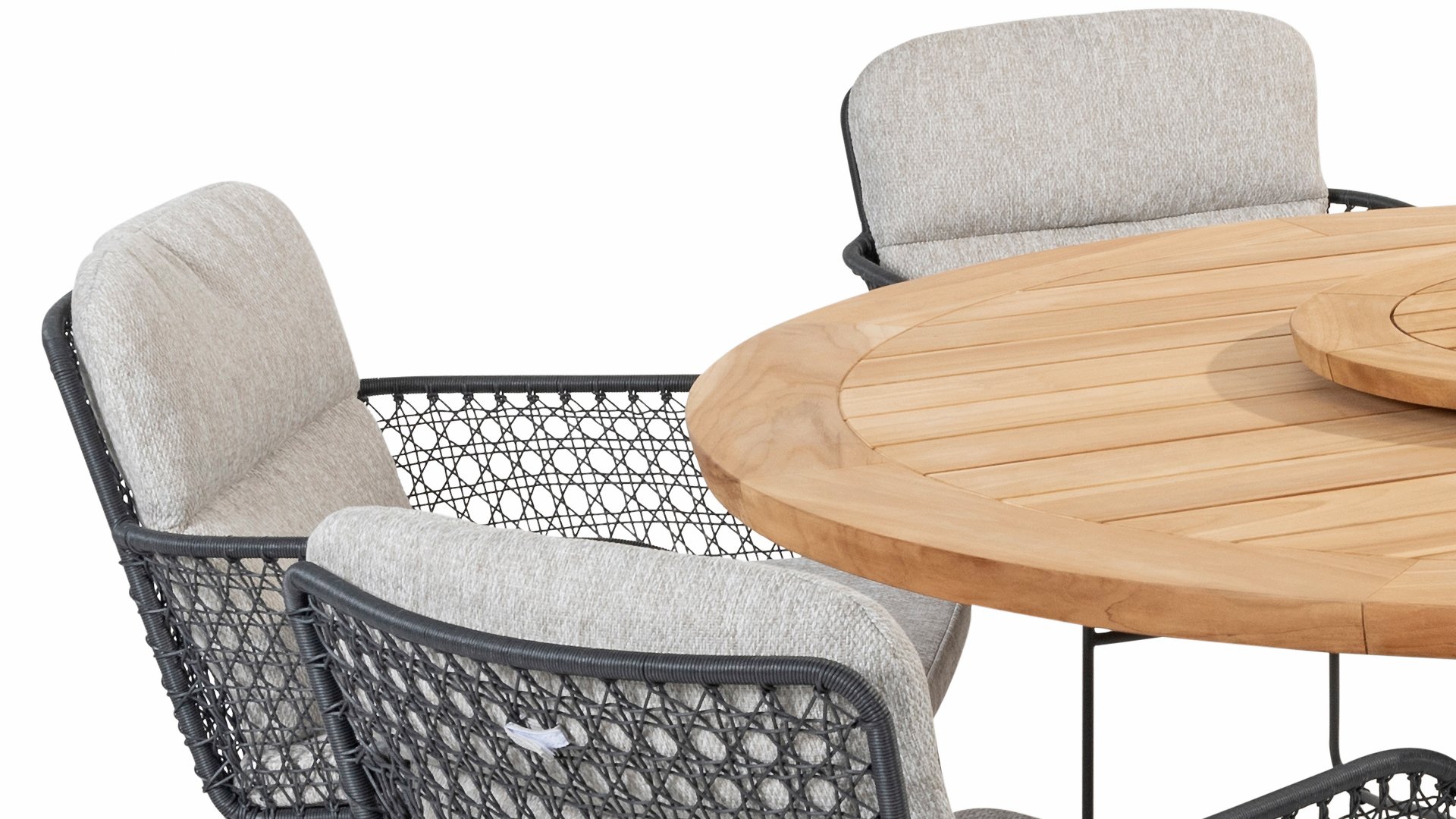 This beautiful material is perfect for outdoor use, because 4SO Rope is not just an shoelace. Our round wires have a synthetic core. This polypropylene base ensures minimal stretching of the rope and also does not absorb moisture. The covering is made of an acrylic fabric, similar to the weather-resistant fabric of our garden cushions. This covering feels soft but is highly water-repellent, UV-resistant, and colorfast. The flat rope variants have the same mix of weather-resistant materials, but the polypropylene material is interwoven with the acrylic fabric. This technique gives the flat rope the same properties but a completely different look. The stretch is minimal, and 4 Seasons Outdoor garden furniture with Rope is suitable for people weighing up to 110 kg. It's therefore an exceptionally strong material, but it's important to be careful with sharp objects. Our Rope is weather-resistant, but a sharp object can seriously damage your garden furniture. We offer exclusive designs using hand-woven Rope patterns and techniques.