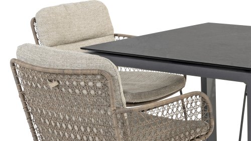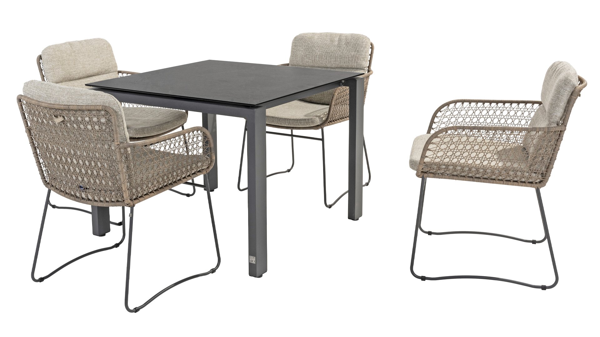 Discover the elegance and durability of the 4 Seasons Outdoor Aprilla pure dining chair in stylish taupe. This chair comes with cushions and has a beautiful pattern of anthracite braiding and an anthracite stainless steel frame.