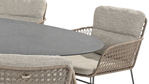 This beautiful material is perfect for outdoor use, because 4SO Rope is not just an shoelace. Our round wires have a synthetic core. This polypropylene base ensures minimal stretching of the rope and also does not absorb moisture. The covering is made of an acrylic fabric, similar to the weather-resistant fabric of our garden cushions. This covering feels soft but is highly water-repellent, UV-resistant, and colorfast. The flat rope variants have the same mix of weather-resistant materials, but the polypropylene material is interwoven with the acrylic fabric. This technique gives the flat rope the same properties but a completely different look. The stretch is minimal, and 4 Seasons Outdoor garden furniture with Rope is suitable for people weighing up to 110 kg. It's therefore an exceptionally strong material, but it's important to be careful with sharp objects. Our Rope is weather-resistant, but a sharp object can seriously damage your garden furniture. We offer exclusive designs using hand-woven Rope patterns and techniques.