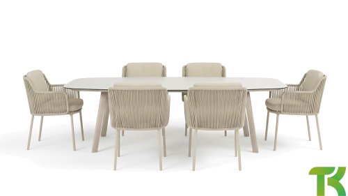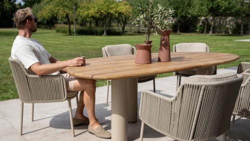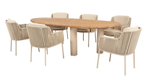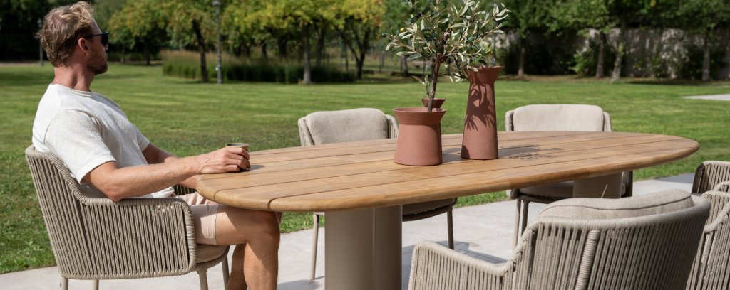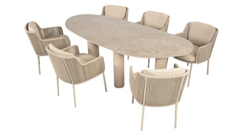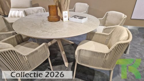 Give your outdoor space a stylish upgrade with the 4 Seasons Outdoor Bernini Garden Set in the new Latte color. This luxurious dining set is inspired by the iconic Italian artist Bernini, known for his flowing lines and refined design. This elegance is reflected in the modern, rounded bucket chairs and the high-quality finish of this trendsetting garden set.