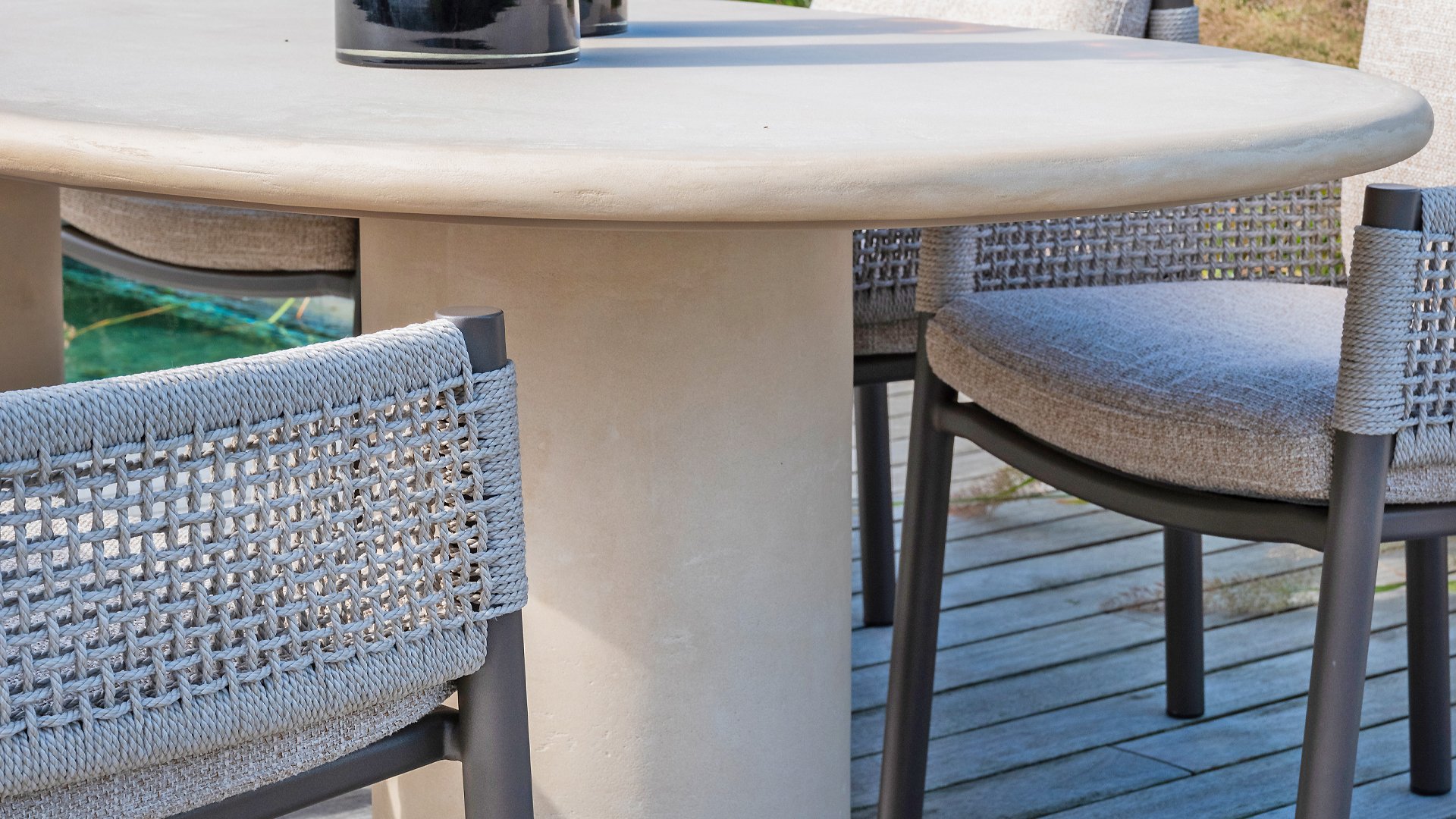 Mortex is made from a mixture of lime, cement, and fine mineral powders. Pigments and resins are added to this mixture to make it flexible, waterproof, and adhere well. It is applied by hand in thin layers and then sanded and finished with a protective sealer or wax. This creates a seamless, strong, and stylish surface suitable for furniture, floors, and walls, among other things. A Mortex garden table is weatherproof. Rain, sunlight, and temperature fluctuations have little effect on the material, provided the table is properly finished with a protective layer. It is important to be careful with acidic substances such as lemon juice, vinegar, or wine. If these remain on the surface for too long, they can damage the protective layer and cause stains.