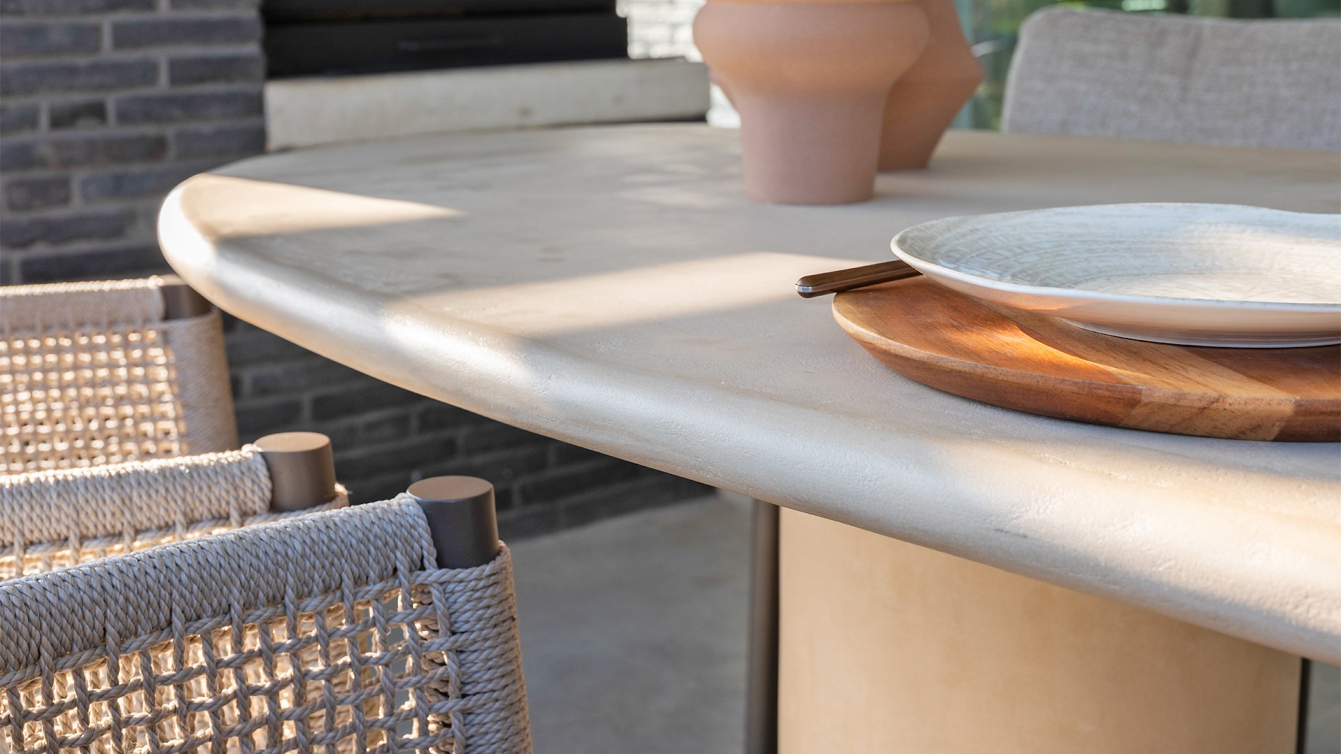 Mortex is made from a mixture of lime, cement, and fine mineral powders. Pigments and resins are added to this mixture to make it flexible, waterproof, and adhere well. It is applied by hand in thin layers and then sanded and finished with a protective sealer or wax. This creates a seamless, strong, and stylish surface suitable for furniture, floors, and walls, among other things. A Mortex garden table is weatherproof. Rain, sunlight, and temperature fluctuations have little effect on the material, provided the table is properly finished with a protective layer. It is important to be careful with acidic substances such as lemon juice, vinegar, or wine. If these remain on the surface for too long, they can damage the protective layer and cause stains.