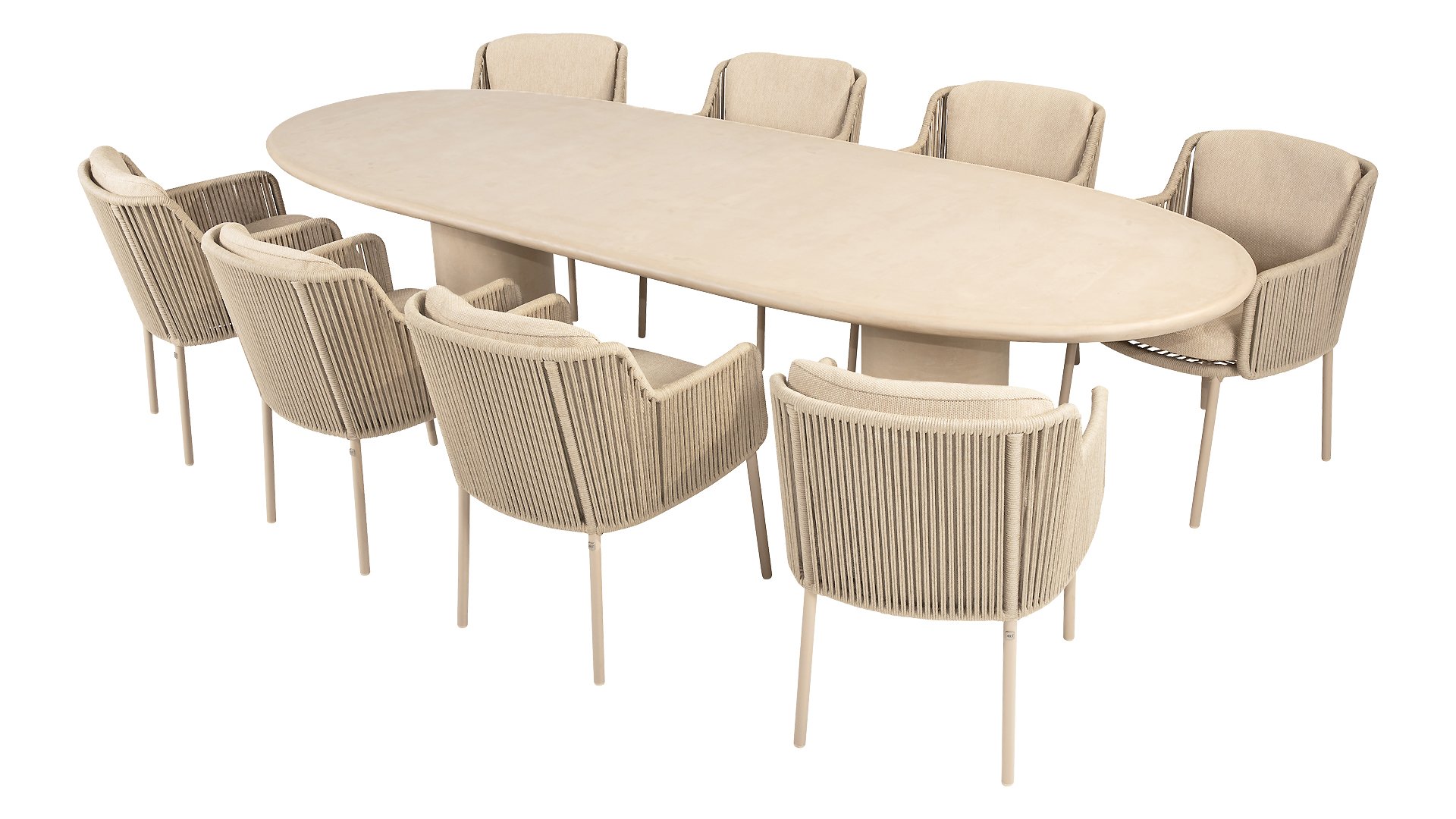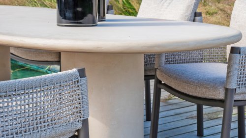 The table is available in various sizes, so there's always a Hampton to suit your outdoor living space. Choose the round Ø160cm version for a cozy setting with a single, elegant central leg, or opt for the generous oval 240cm or 300cm versions, both featuring two sleek, vertical legs that provide stability and a bold, linear design. For those who prefer a more relaxed dining experience, there's also a low-dining version Ø160cm, ideal for relaxing moments in lounge style.