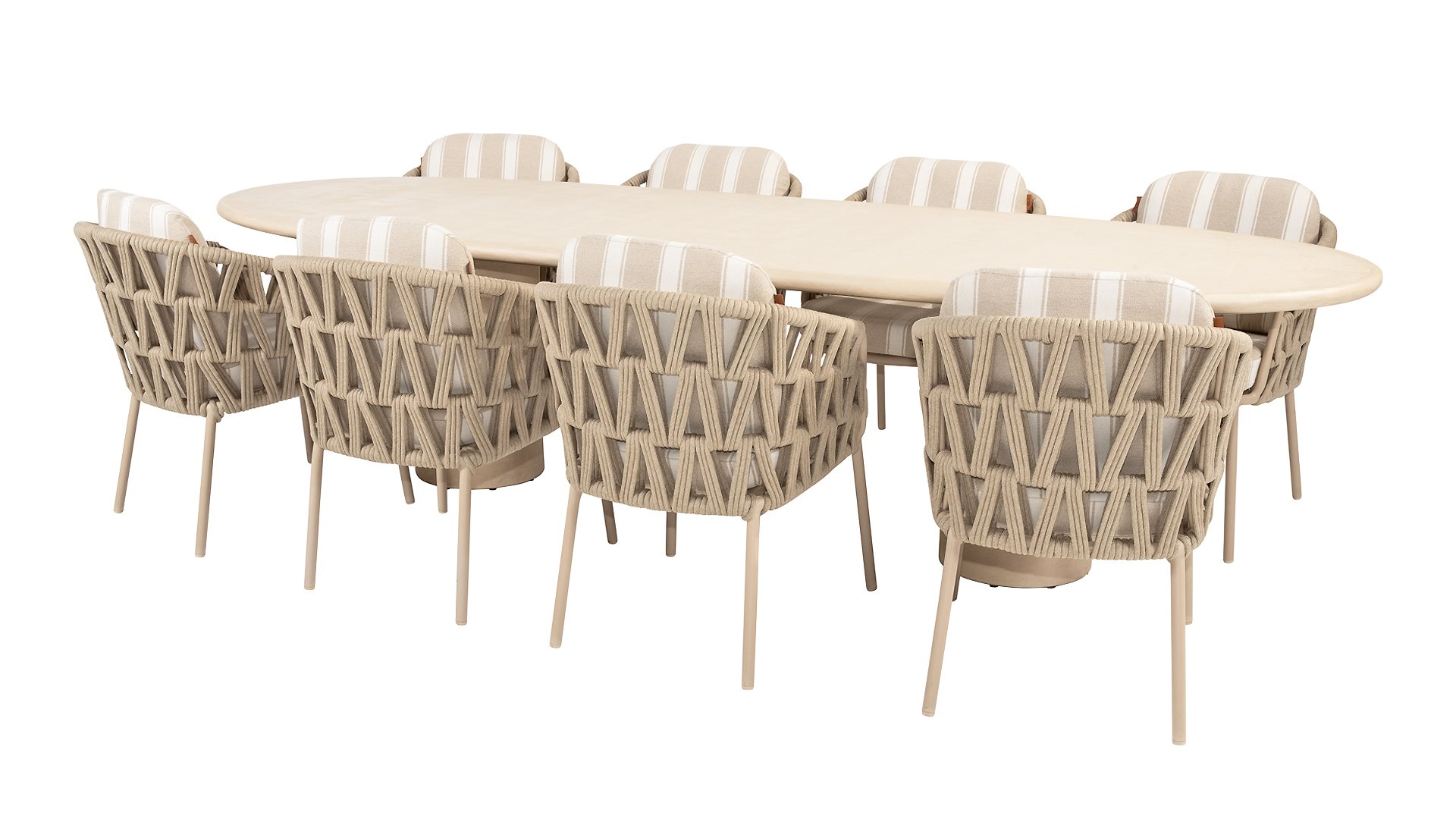 The table is available in various sizes, so there's always a Hampton to suit your outdoor living space. Choose the round Ø160cm version for a cozy setting with a single, elegant central leg, or opt for the generous oval 240cm or 300cm versions, both featuring two sleek, vertical legs that provide stability and a bold, linear design. For those who prefer a more relaxed dining experience, there's also a low-dining version Ø160cm, ideal for relaxing moments in lounge style.