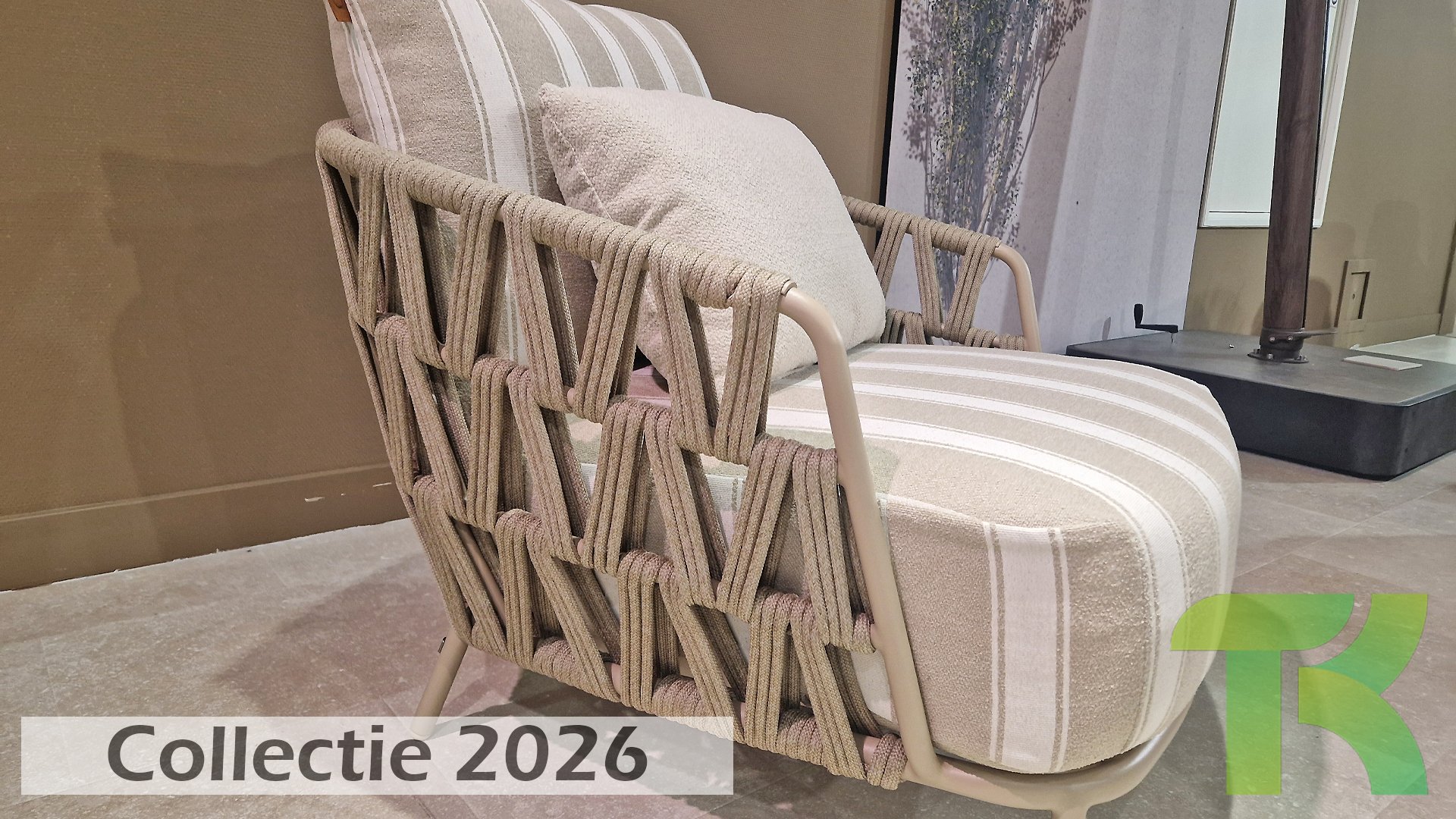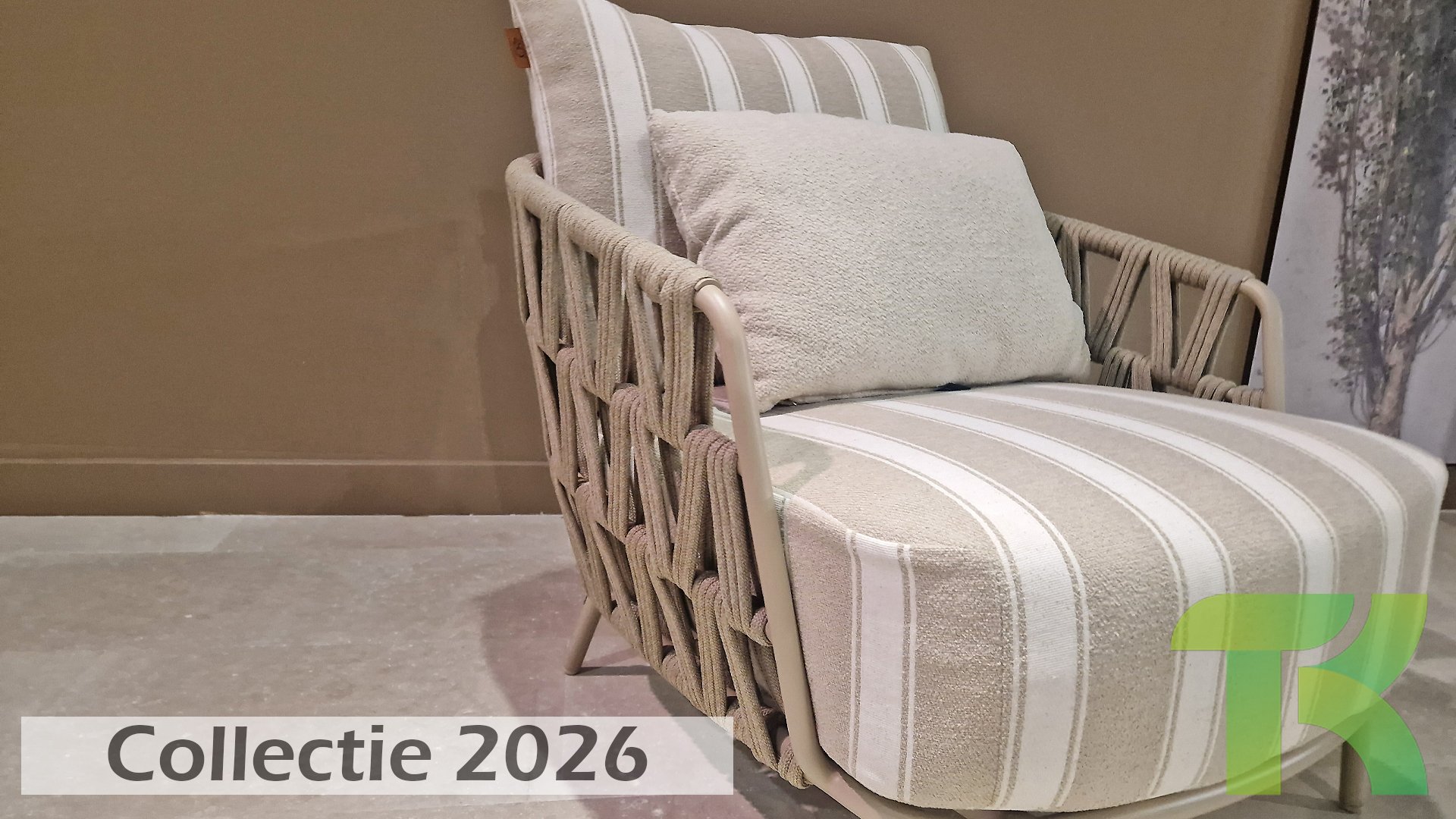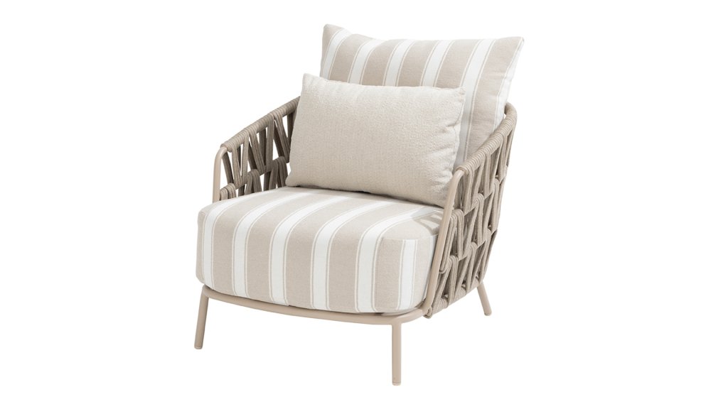 The 4 Seasons Outdoor Beverly is a stylish and comfortable lounge that adds a refined ambiance to your garden, patio, or veranda. With its natural latte-colored Rope finish and soft, boucle-striped cream cushions, this lounge exudes both tranquility and elegance. The design is spacious, inviting, and perfect for long, relaxing moments outdoors.