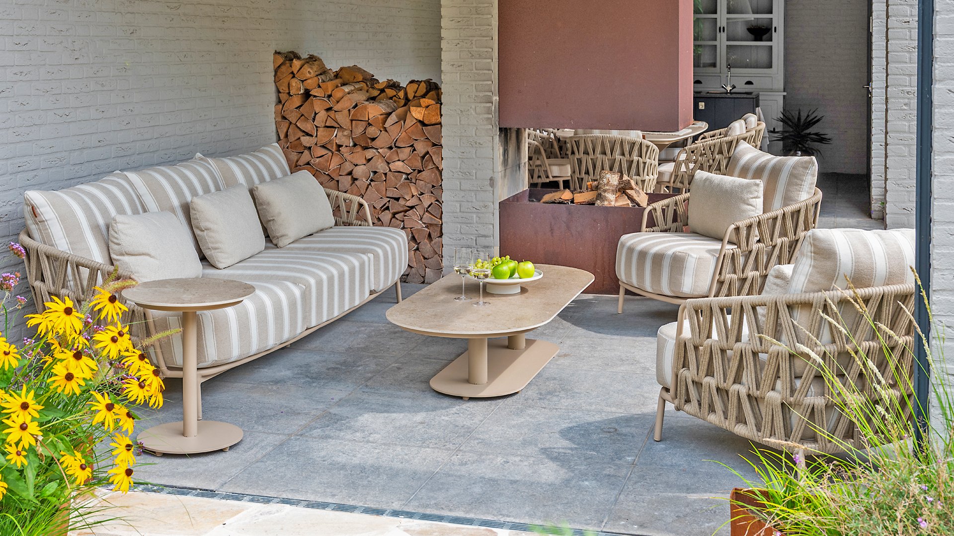 The frame is made of strong, powder-coated aluminum in a warm sand tone and finished with hand-woven Rope in a sleek pattern. The thick cushions offer not only a luxurious look but also excellent seating comfort. The Olefin cushion covers are weatherproof, colorfast, and quick-drying – ideal for the our climate.