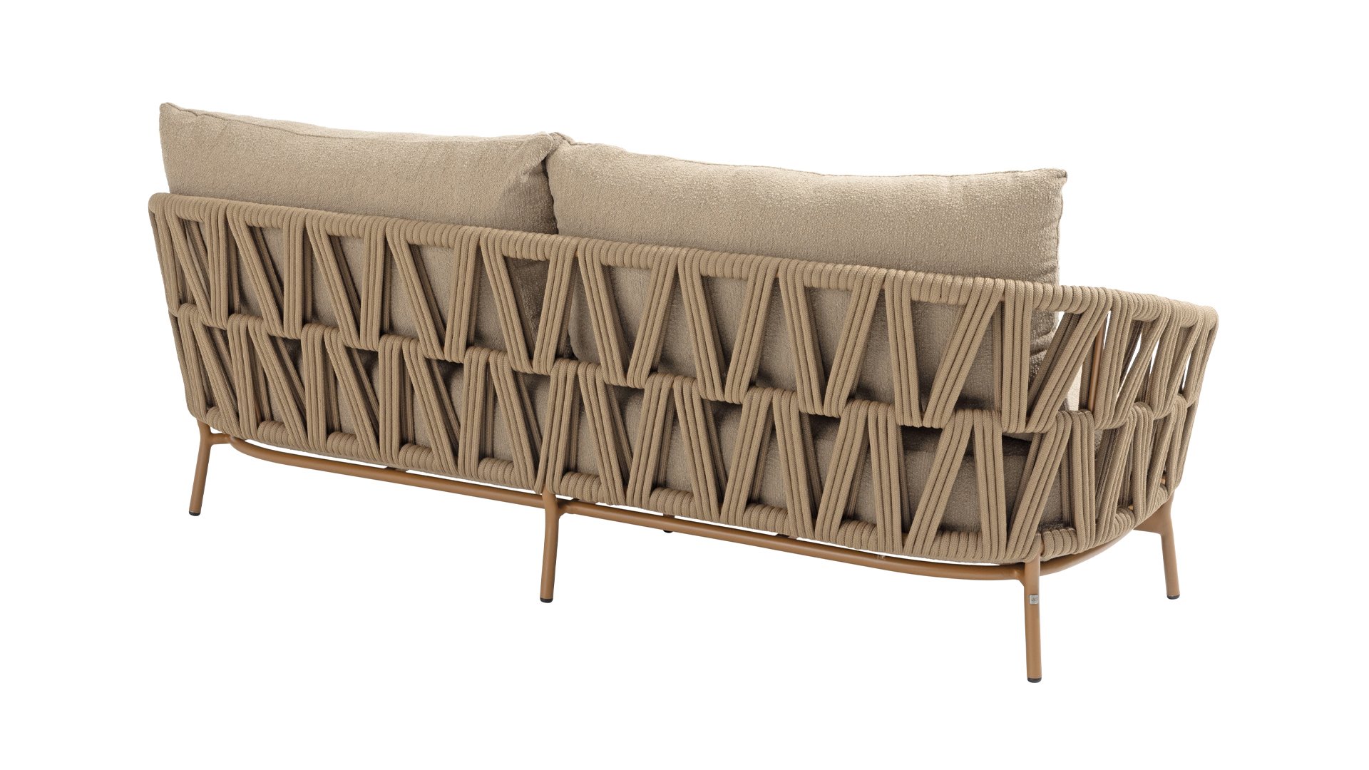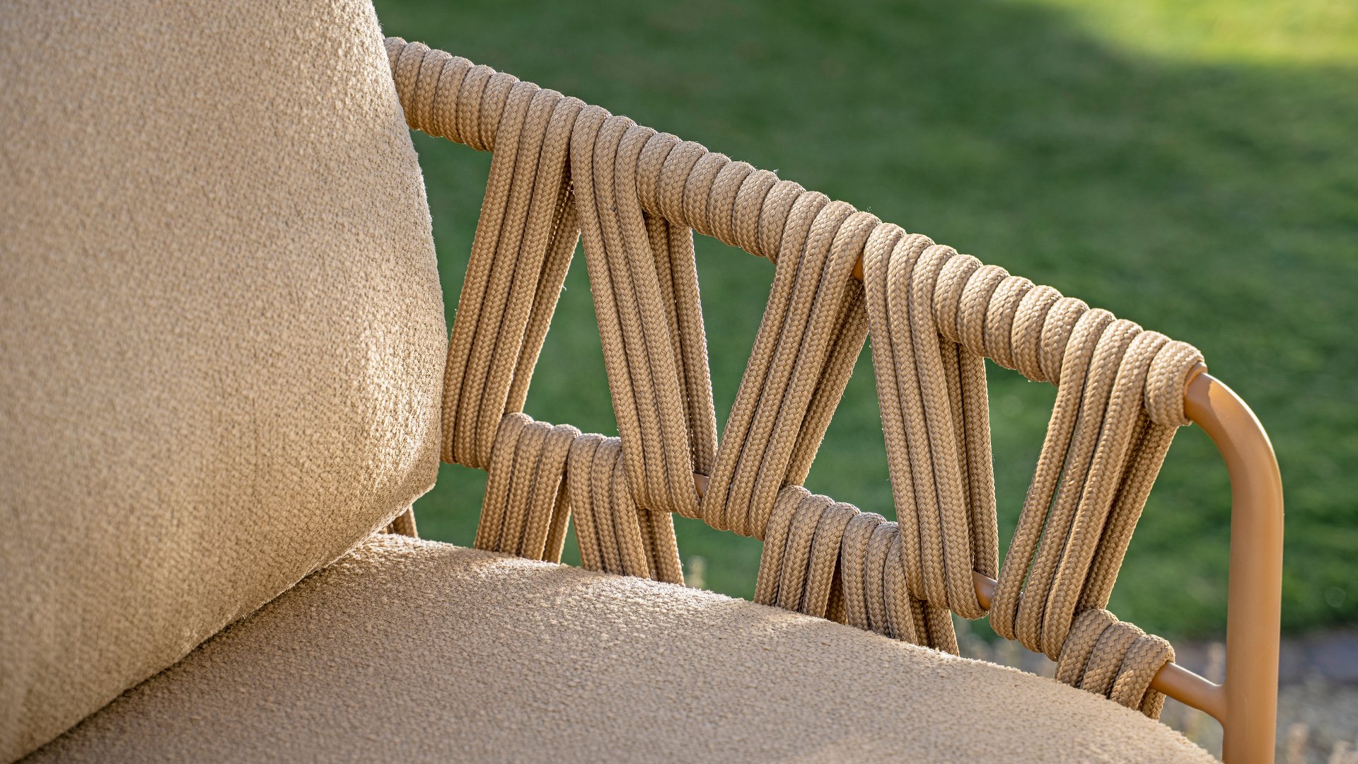The sturdy frame is crafted from powder-coated aluminum in a warm earth tone, combined with strikingly thick rope wickerwork. This artisanal finish gives the Biarritz series a robust yet refined appearance. The spacious seats, plump cushions, and soft textures make this lounge a luxurious place to spend long summer days.