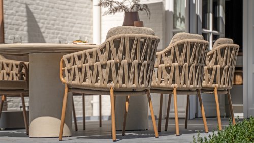 The sturdy frame is crafted from powder-coated aluminum in a warm earth tone, combined with strikingly thick rope wickerwork. This artisanal finish gives the Biarritz series a robust yet refined appearance. The spacious seats, plump cushions, and soft textures make this lounge a luxurious place to spend long summer days.