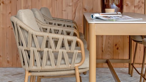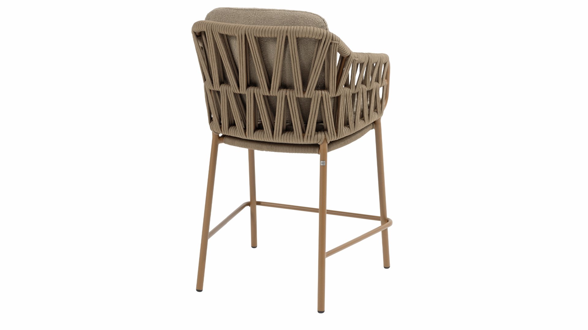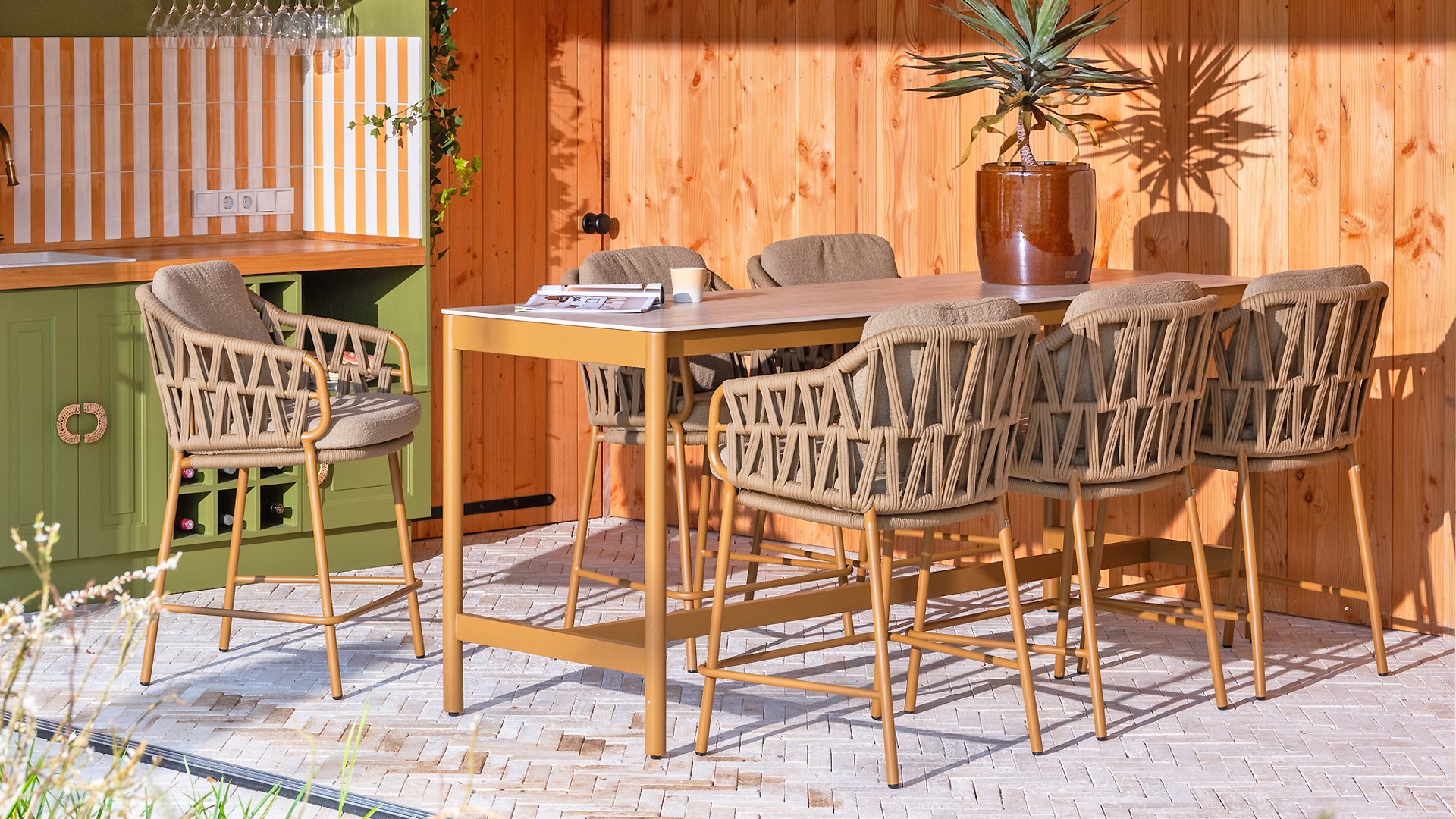 The 4 Seasons Outdoor Biarritz Amber High Dining set is a perfect choice if you're looking for something between a bar chair and a garden chair. With its generously woven rope details in a deep amber color and the richly filled cushions in a soft, amber bouclé fabric, this set invites you to relax in your garden or on your patio.