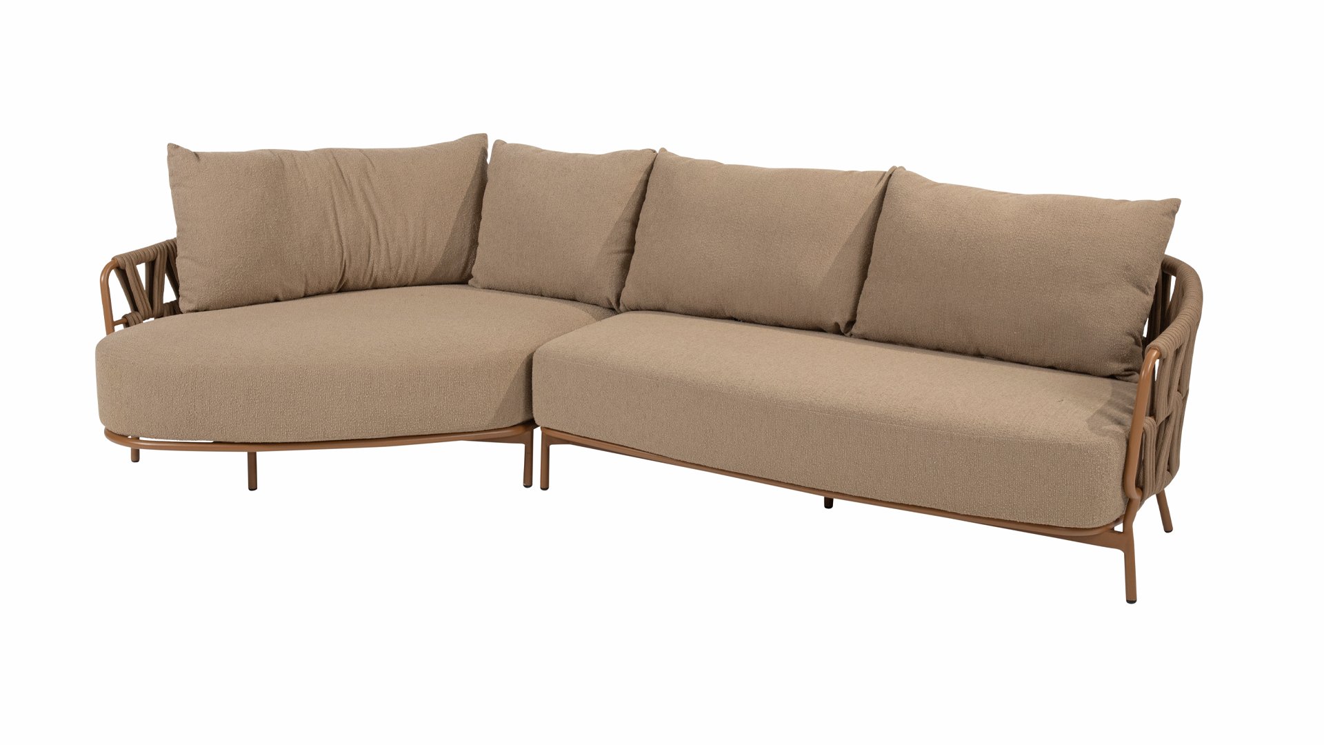 The 4 Seasons Outdoor Biarritz Amber is an elegant and modern lounge collection that exudes warmth and comfort. With its generously woven rope details in a deep amber color and the richly filled cushions in a soft, amber bouclé fabric, this set invites ultimate relaxation in your garden or on your patio.
