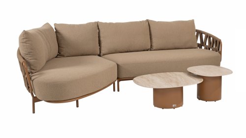 The 4 Seasons Outdoor Biarritz Amber is an elegant and modern lounge collection that exudes warmth and comfort. With its generously woven rope details in a deep amber color and the richly filled cushions in a soft, amber bouclé fabric, this set invites ultimate relaxation in your garden or on your patio.