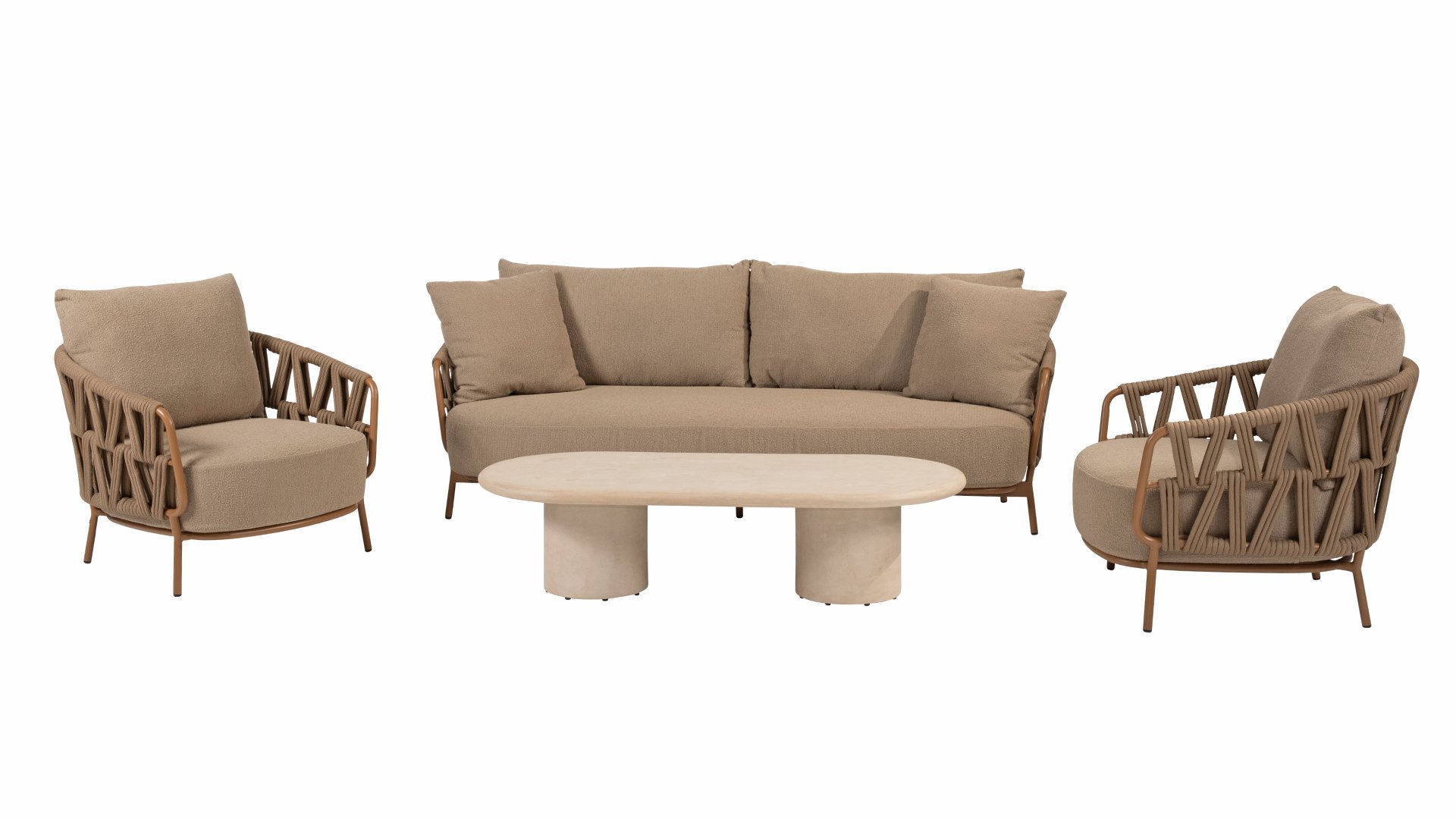 The 4 Seasons Outdoor Biarritz Amber is an elegant and modern lounge collection that exudes warmth and comfort. With its generously woven rope details in a deep amber color and the richly filled cushions in a soft, amber bouclé fabric, this set invites ultimate relaxation in your garden or on your patio.