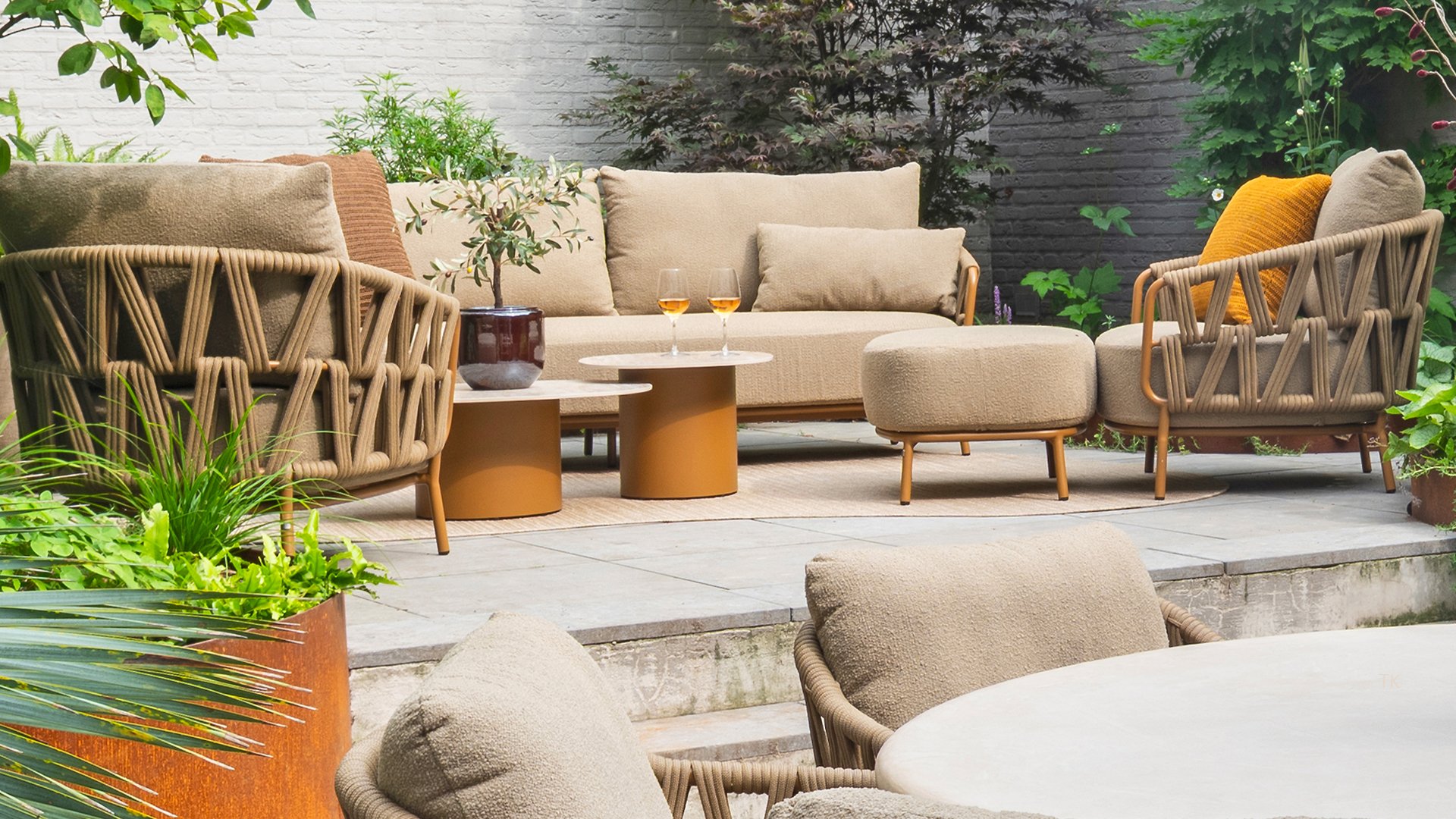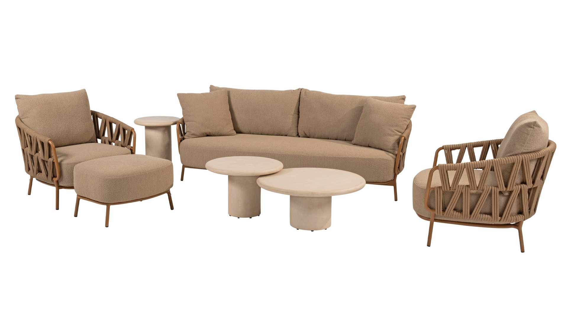 The 4 Seasons Outdoor Biarritz Amber is an elegant and modern lounge collection that exudes warmth and comfort. With its generously woven rope details in a deep amber color and the richly filled cushions in a soft, amber bouclé fabric, this set invites ultimate relaxation in your garden or on your patio.