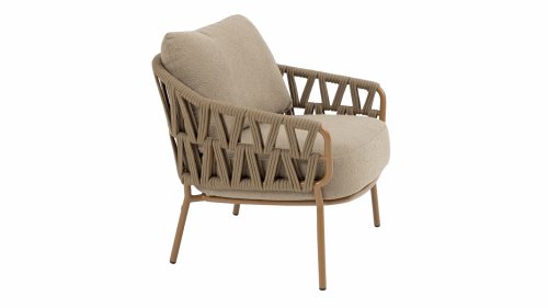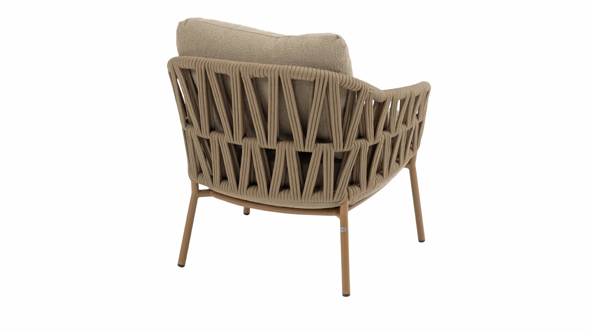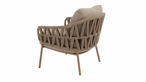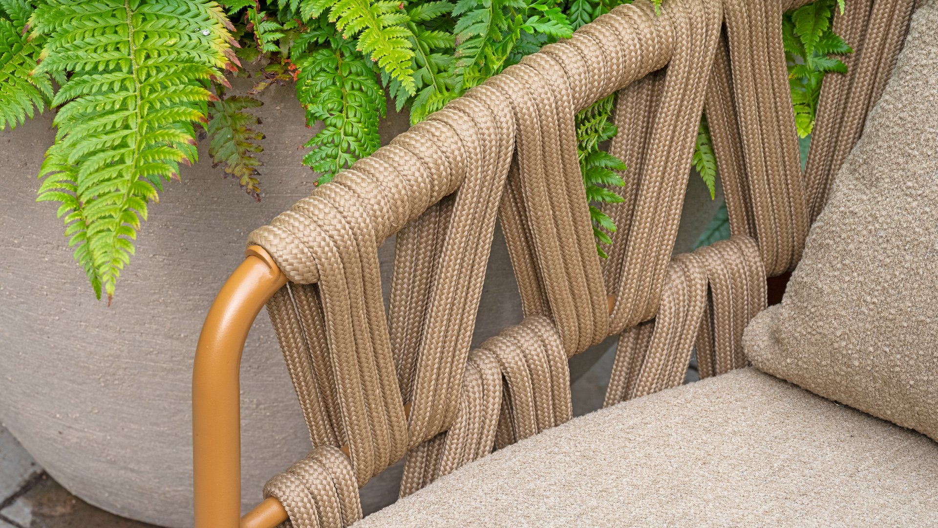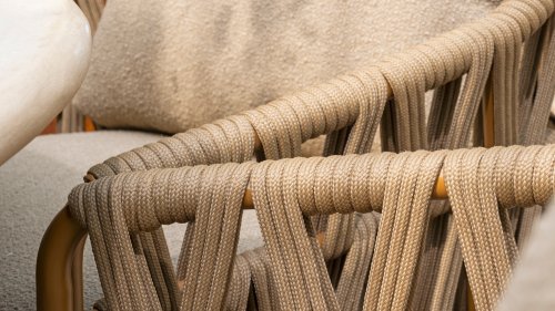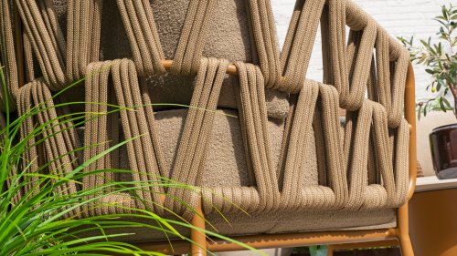 The sturdy frame is crafted from powder-coated aluminum in a warm earth tone, combined with strikingly thick rope wickerwork. This artisanal finish gives the Biarritz series a robust yet refined appearance. The spacious seats, plump cushions, and soft textures make this lounge a luxurious place to spend long summer days.