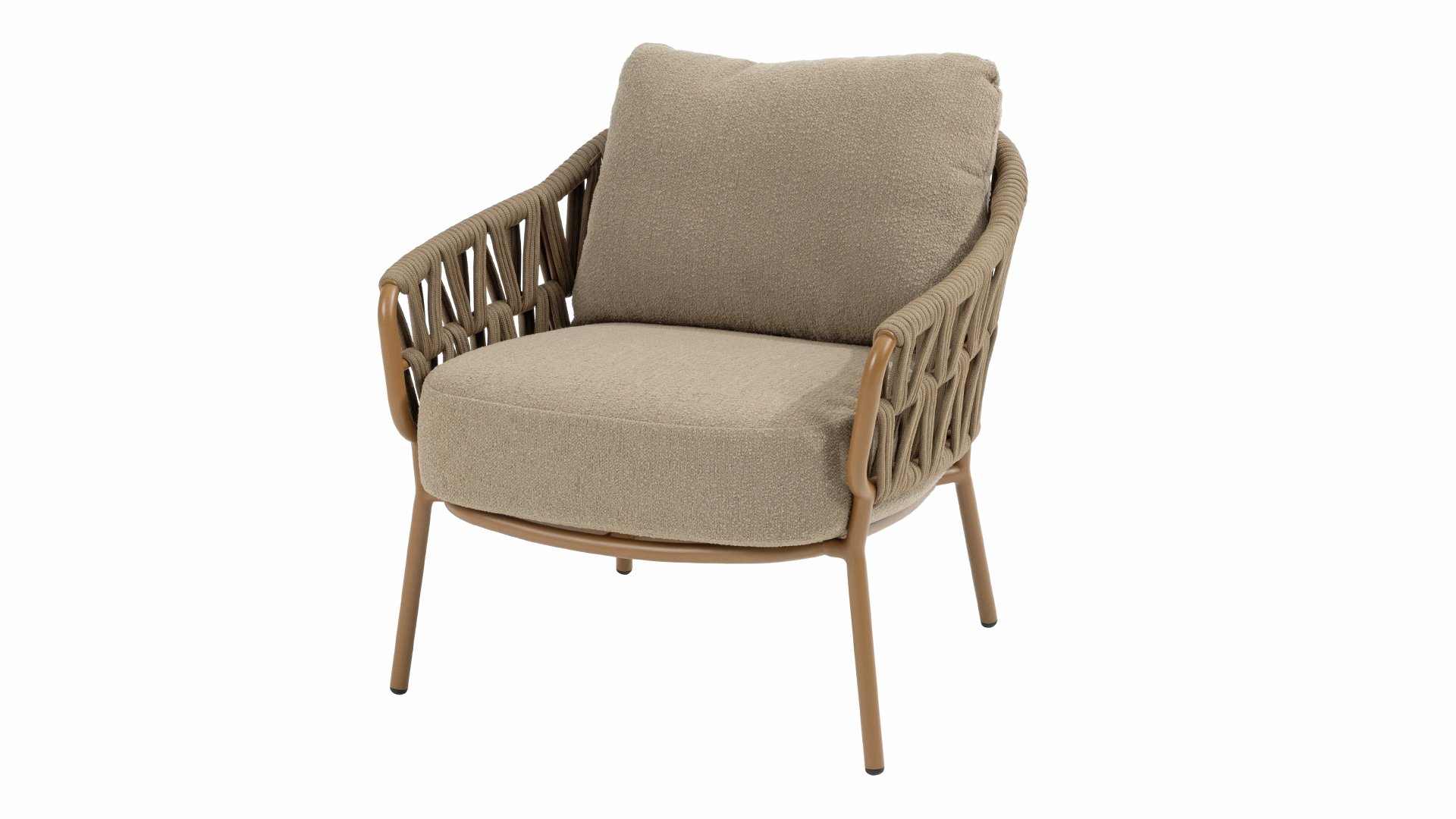 The 4 Seasons Outdoor Biarritz Amber Low Dining set is a perfect choice for any outdoor space. Enjoy both a little bit of lounging and dining in the Biarritz Low Dining set—the best of both worlds. With its generously woven rope details in a deep amber color and the richly filled cushions in a soft, amber bouclé fabric, this set invites ultimate relaxation in your garden or on your patio.