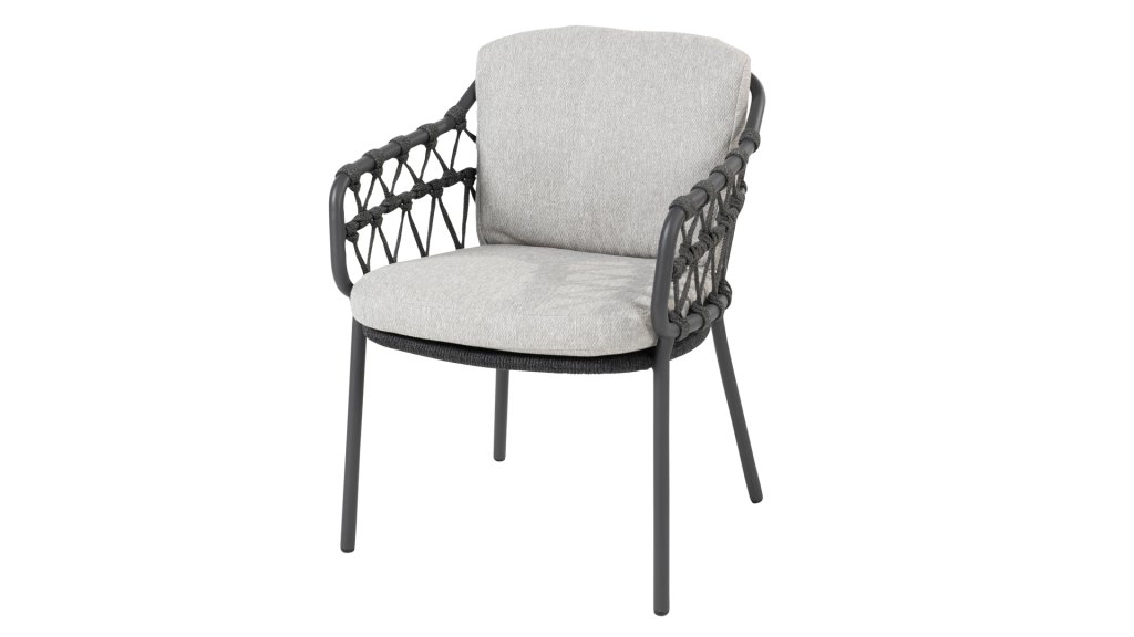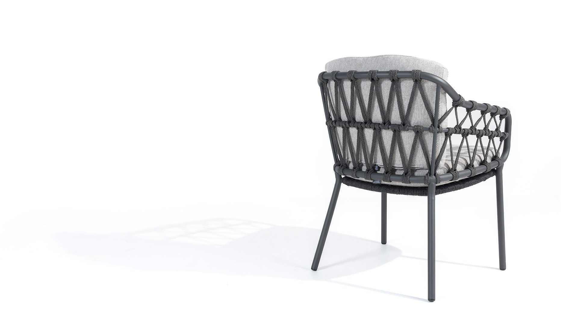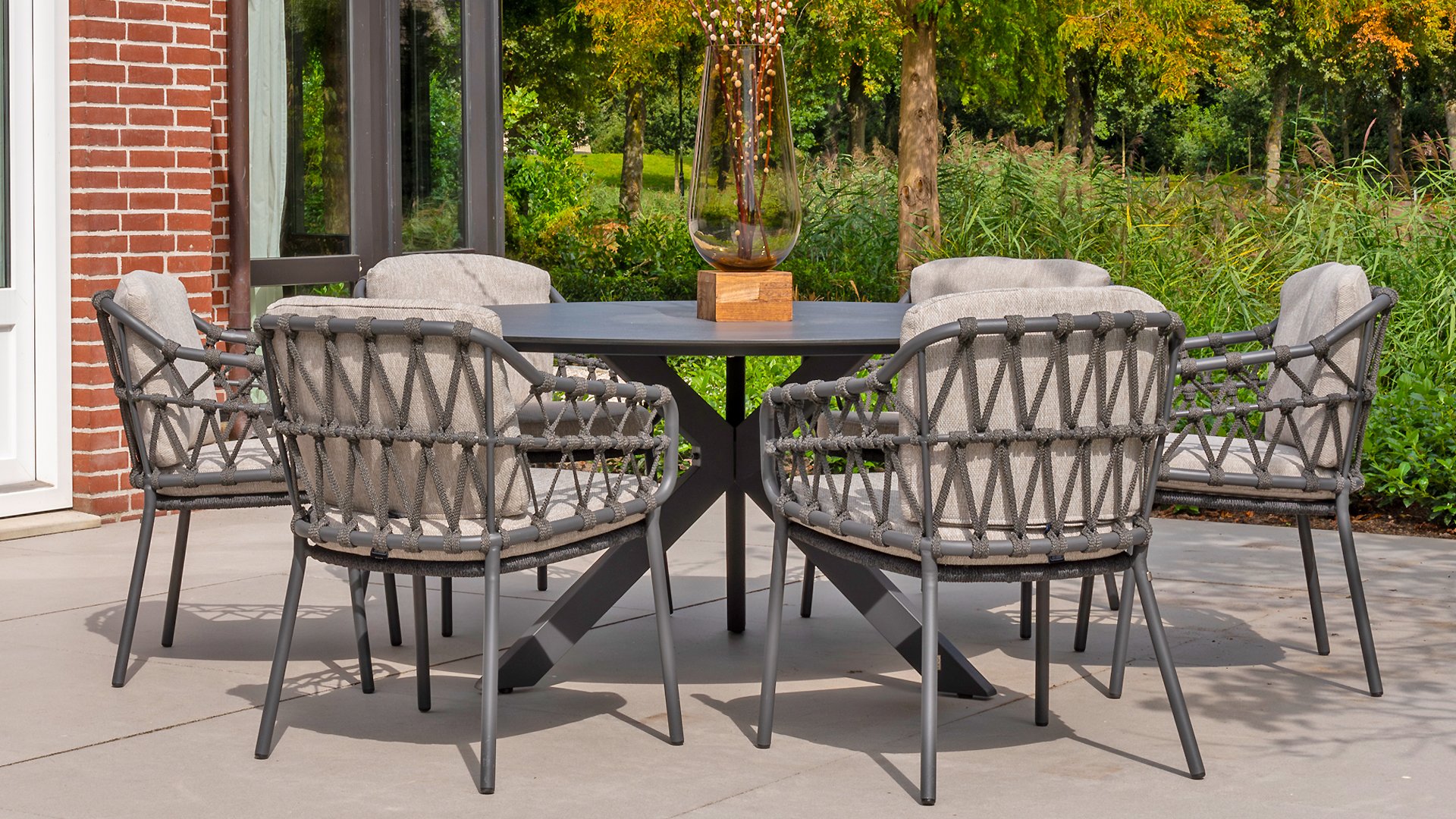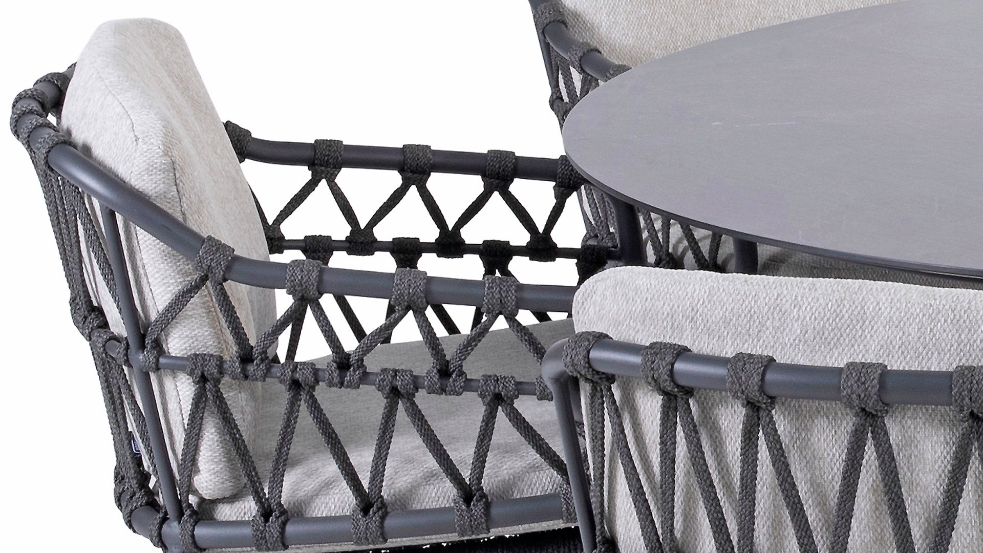 The Calpi dining from 4 Seasons Outdoor features a contemporary design and gives every terrace the premium look you are looking for. The wide rope parts are woven in an original way, giving the Calpi an open character. The Calpi is supplied with a seat and back cushion in an all-weather fabric. This fabric has a water and dirt-repellent effect, making it resistant to many weather influences.