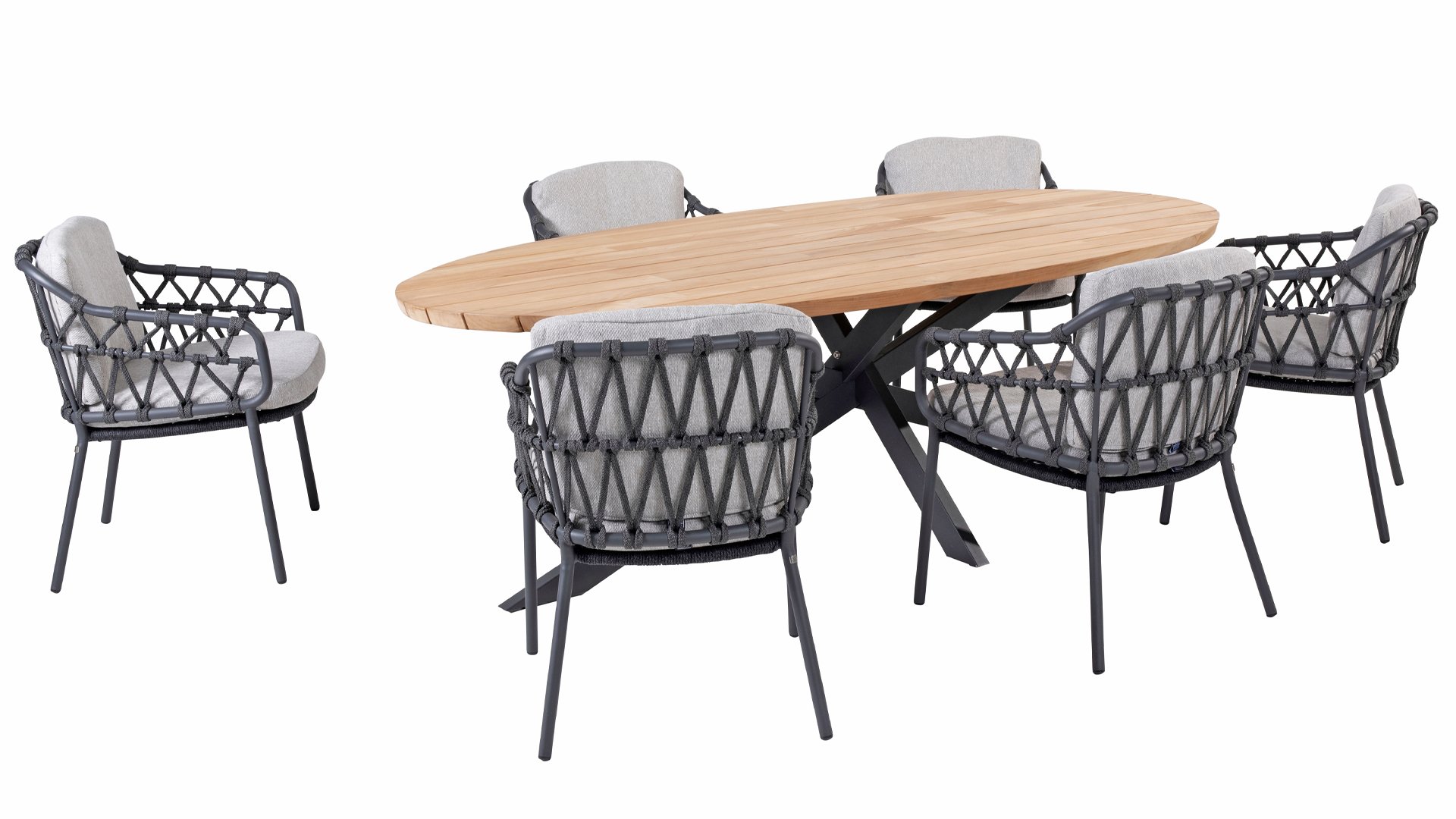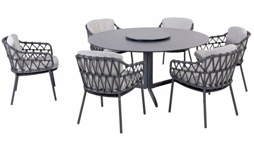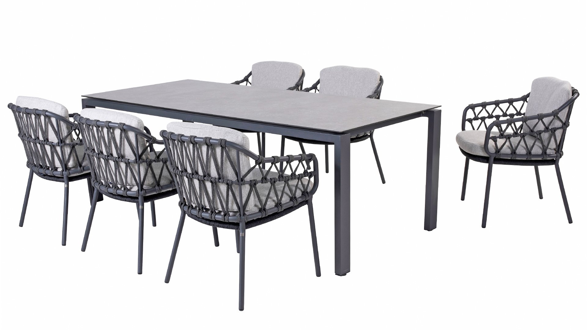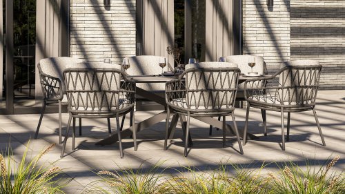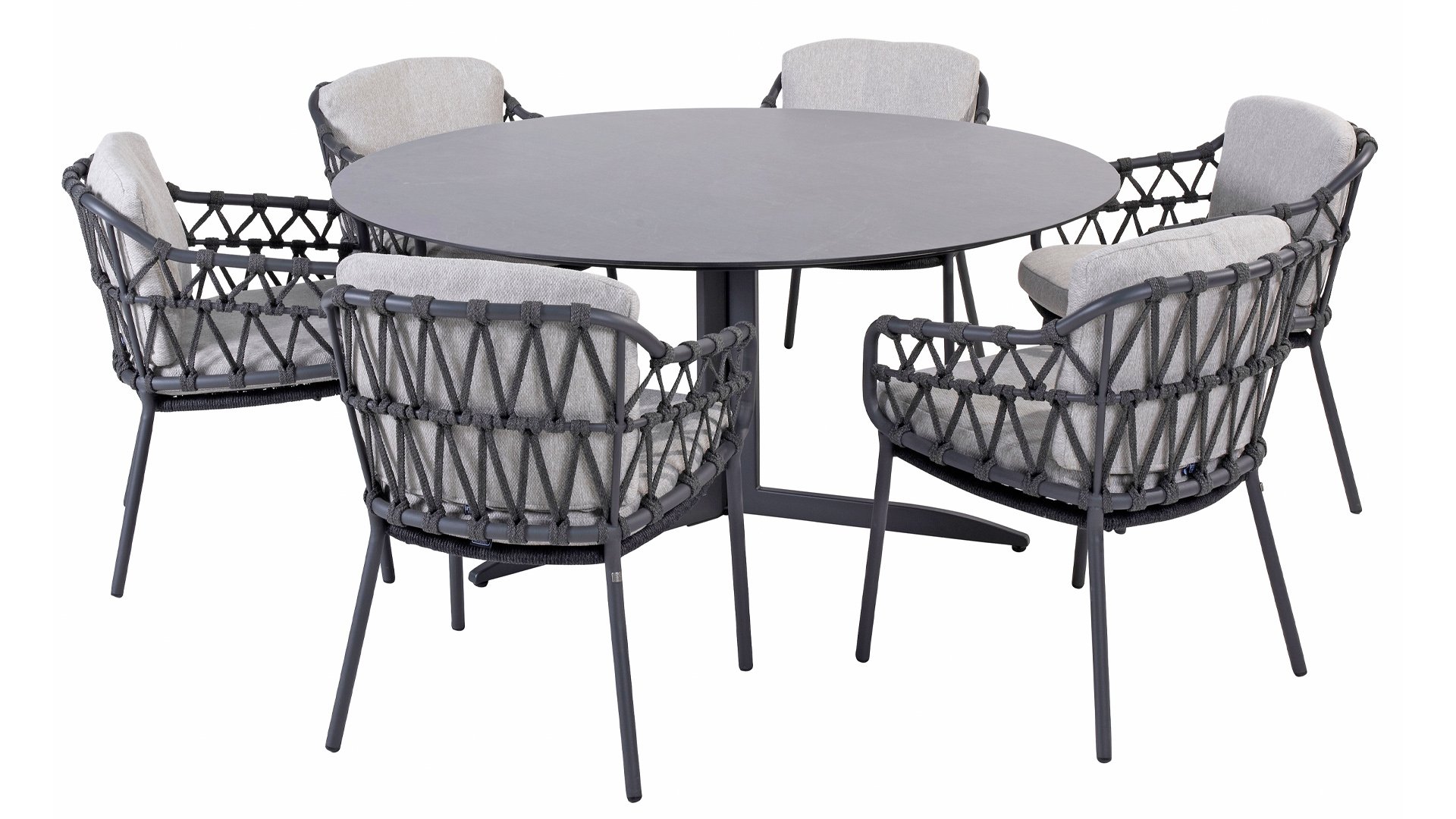 The Calpi dining from 4 Seasons Outdoor features a contemporary design and gives every terrace the premium look you are looking for. The wide rope parts are woven in an original way, giving the Calpi an open character. The Calpi is supplied with a seat and back cushion in an all-weather fabric. This fabric has a water and dirt-repellent effect, making it resistant to many weather influences.