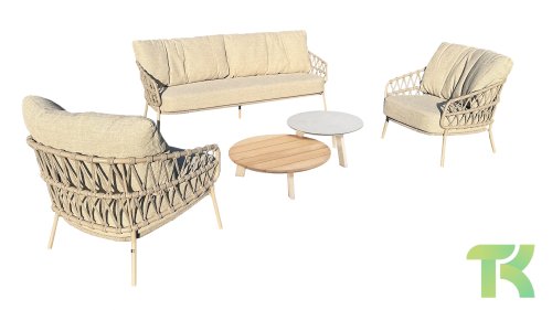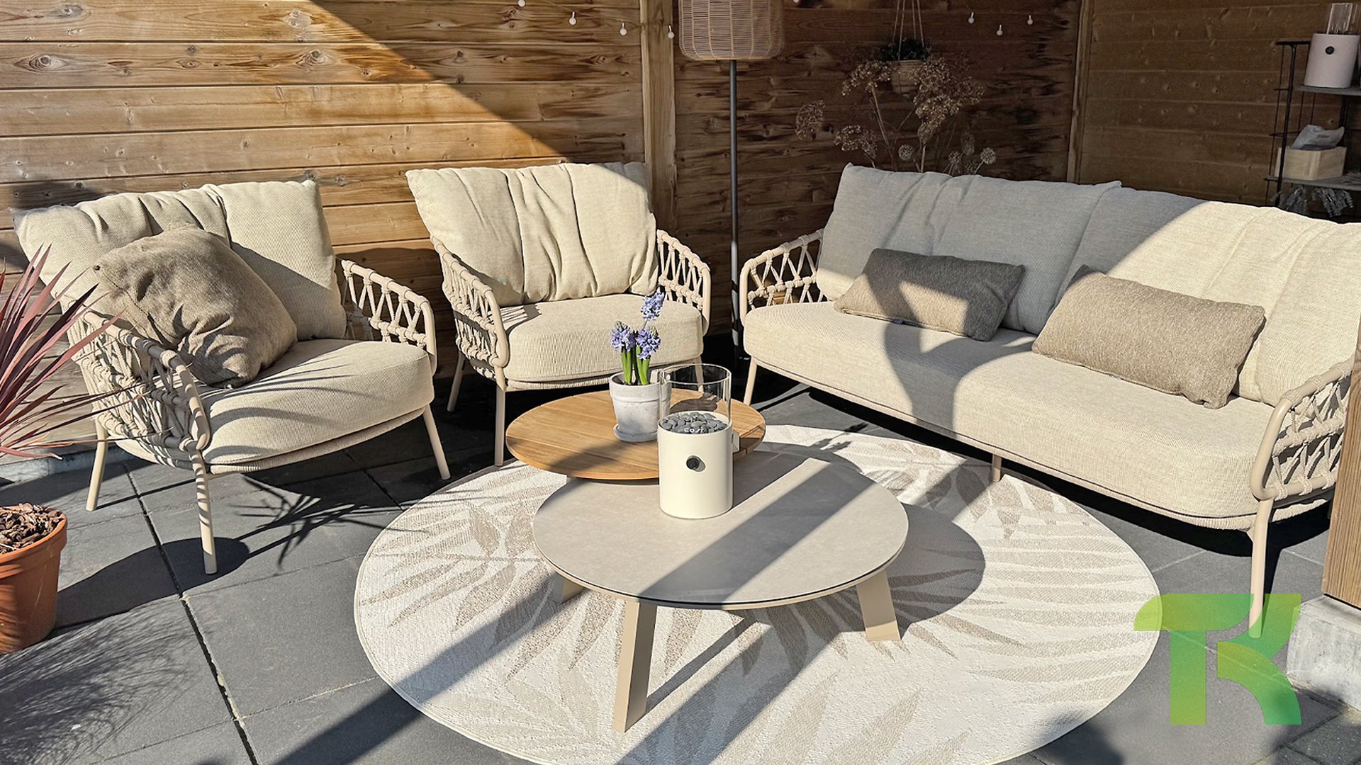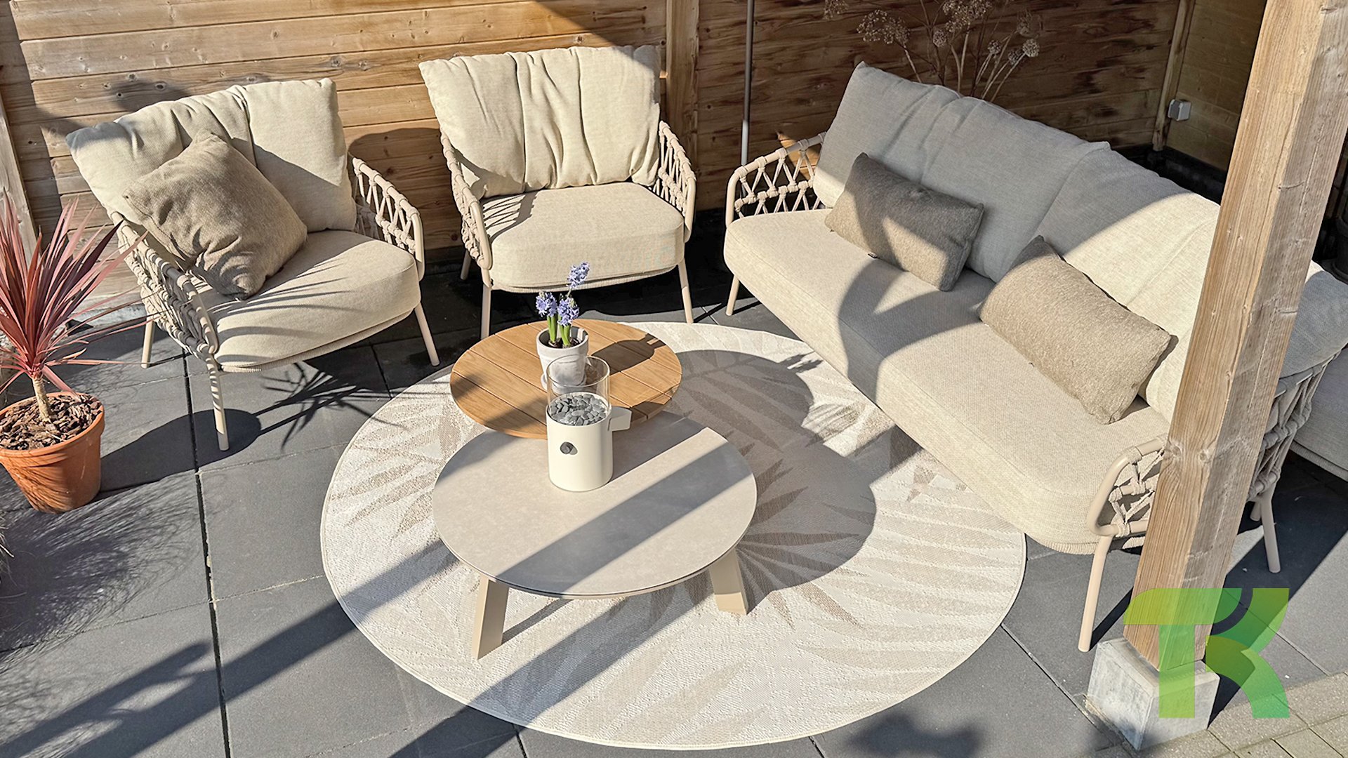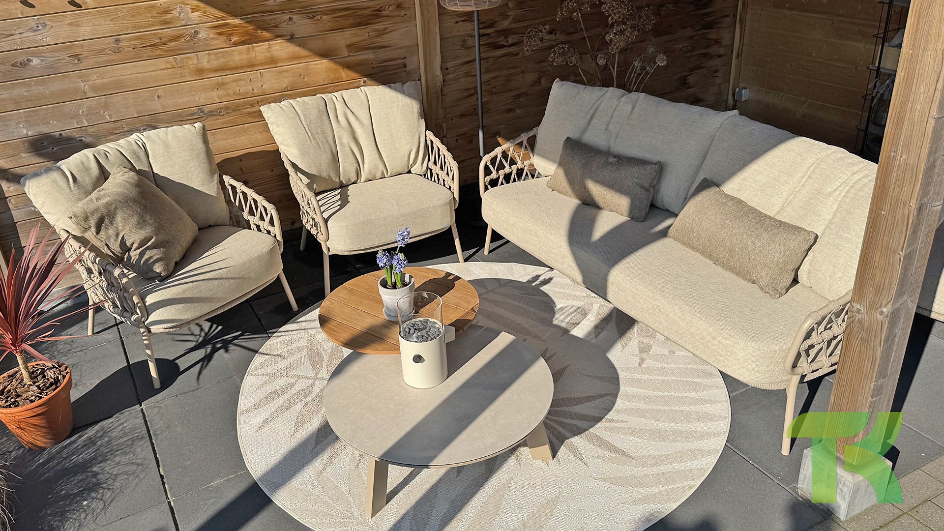 The 4 Seasons Outdoor Calpi series in a new design, Latte. Only available at Garden Furniture Discount! It has a contemporary design and gives every terrace the premium and warm looks you are looking for. The broad rope parts are woven in an original way, giving the Calpi an open character. The 4Seasons Calpi comes with cushions in an all-weather fabric. This fabric is water and dirt repellent, making it resistant to many weather conditions. The frame is made of powder-coated stainless steel, making the 4SO Calpi Lounge Set very suitable to leave outside all year round.