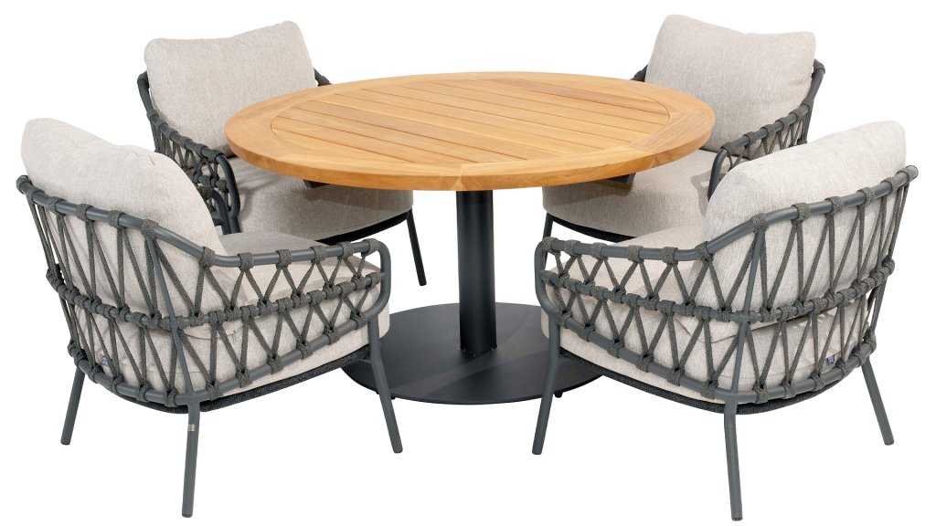 The 4Seasons Saba low dining table has a powder-coated stainless steel base with a teak wood tabletop. We recommend maintaining the teak wood with our maintenance products from 4 Seasons Outdoor to ensure a long lifespan and a beautiful appearance. The Calpi chair consists of a stainless steel base with rope parts that are resistant to various weather conditions.