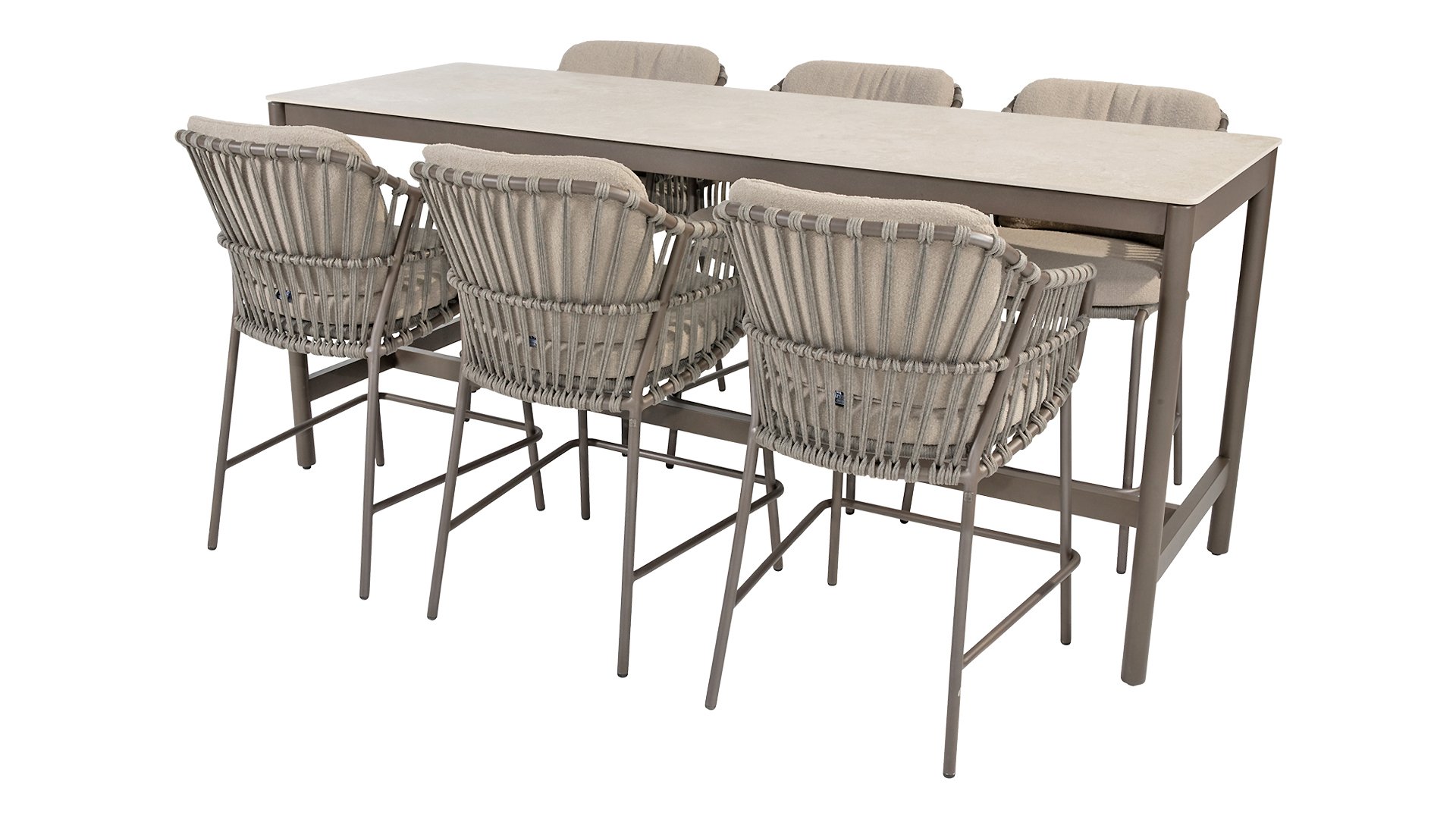 What makes this chair truly unique is the combination of taupe cushions and a terre-colored frame, giving it a warm and sophisticated look that fits various outdoor environments. The cushions are upholstered with Bouclé, a luxurious fabric that feels soft and pleasant while also containing Olefin - a material that is highly resistant to fading from sunlight and weatherproof. This makes the 4Seasons Capalbio Counter Chair not only beautiful but also practical and low maintenance. The Capalbio offers various options; in this series, the following variations are available: Lounge set, Garden set, Low Dining set & Counter set.