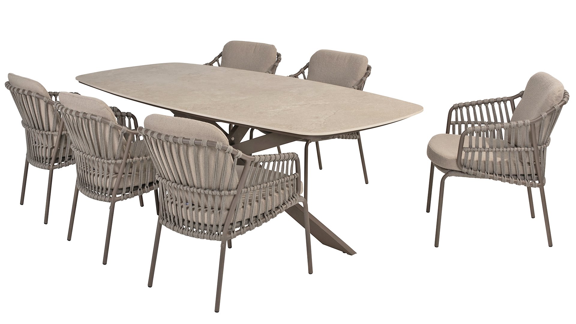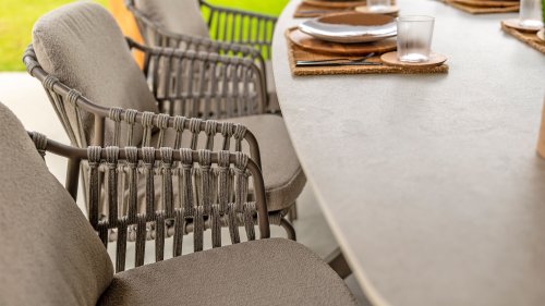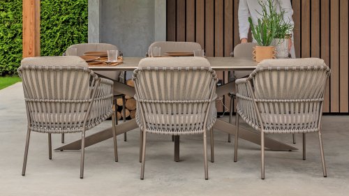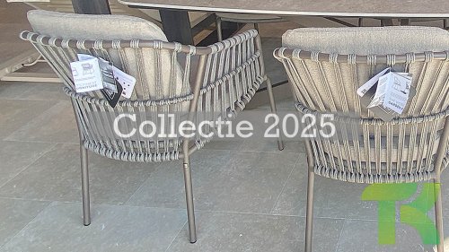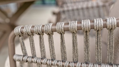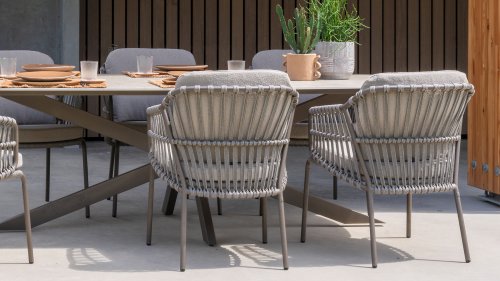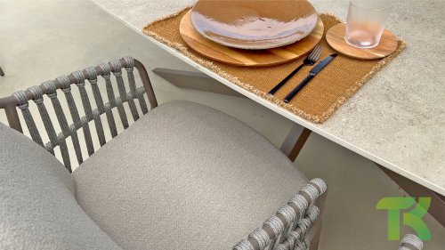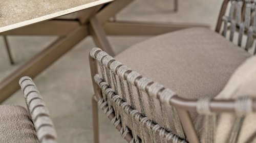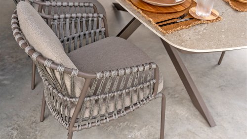 The 4SO Capalbio garden chair is a stylish addition to your outdoor space, with an elegant design that offers both comfort and aesthetics. The base is finished in a warm terra brown color, providing a natural look. The chair is further enhanced with a gray-colored rope, adding a modern twist and ensuring a comfortable seating experience.