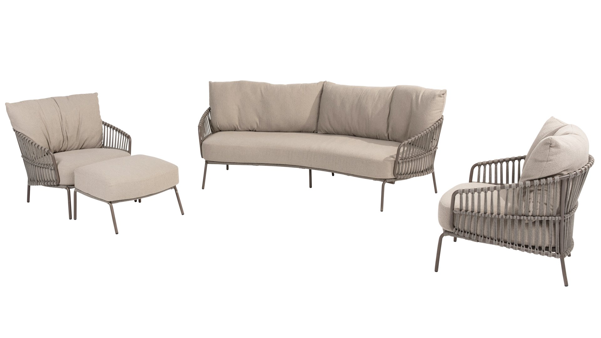 Experience the ultimate lounge comfort with the 4 Seasons Capalbio lounge sets. This lounge is designed to make you dream away in the extra thick cushions made of soft bouclé fabric. The modern design, with its elegant curves and open rope patterns, adds a stylish touch to any garden.