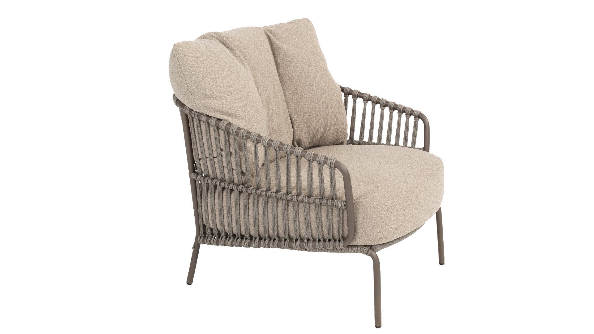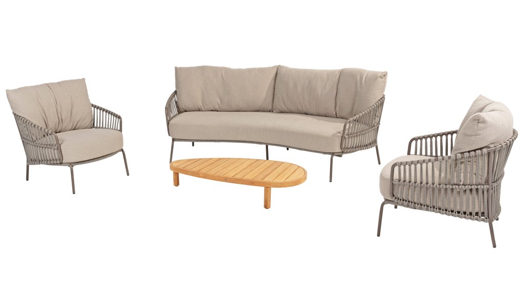 Experience ultimate lounge comfort with the 4 Seasons Capalbio lounge sets. This lounge is designed to let you daydream in the extra thick cushions made of soft bouclé fabric. The modern design, with its elegant curves and open Rope patterns, adds a stylish touch to any garden.