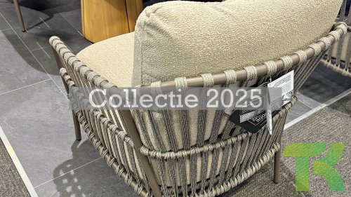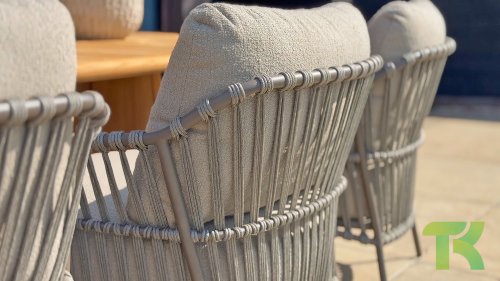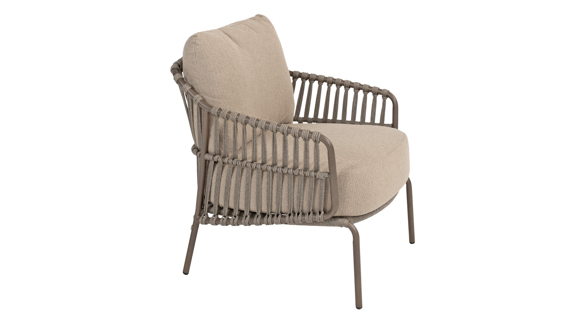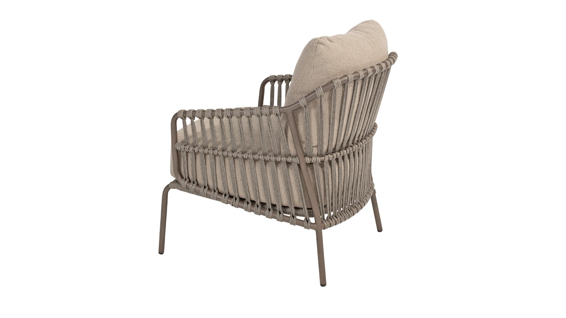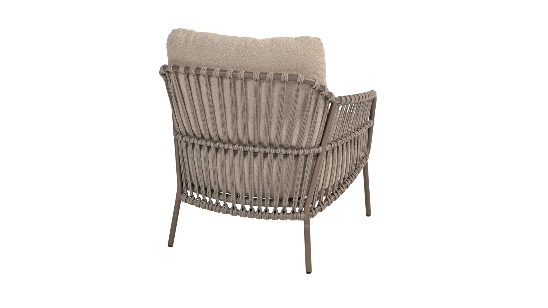 Experience the ultimate lounge comfort with the 4 Seasons Capalbio Low-Dining. This chair is designed to let you daydream in the extra thick cushions of soft bouclé fabric. The modern design, with its elegant curves and open Rope patterns, adds a stylish touch to any garden.