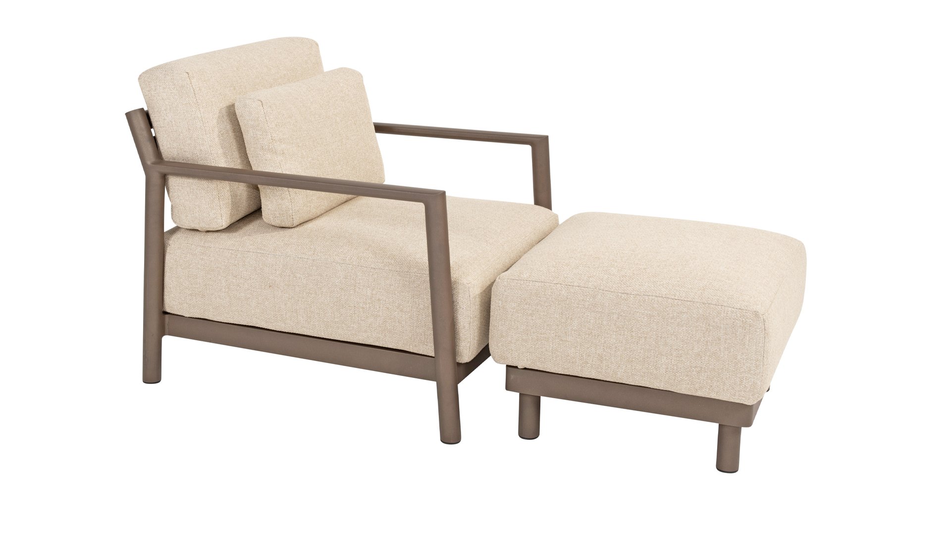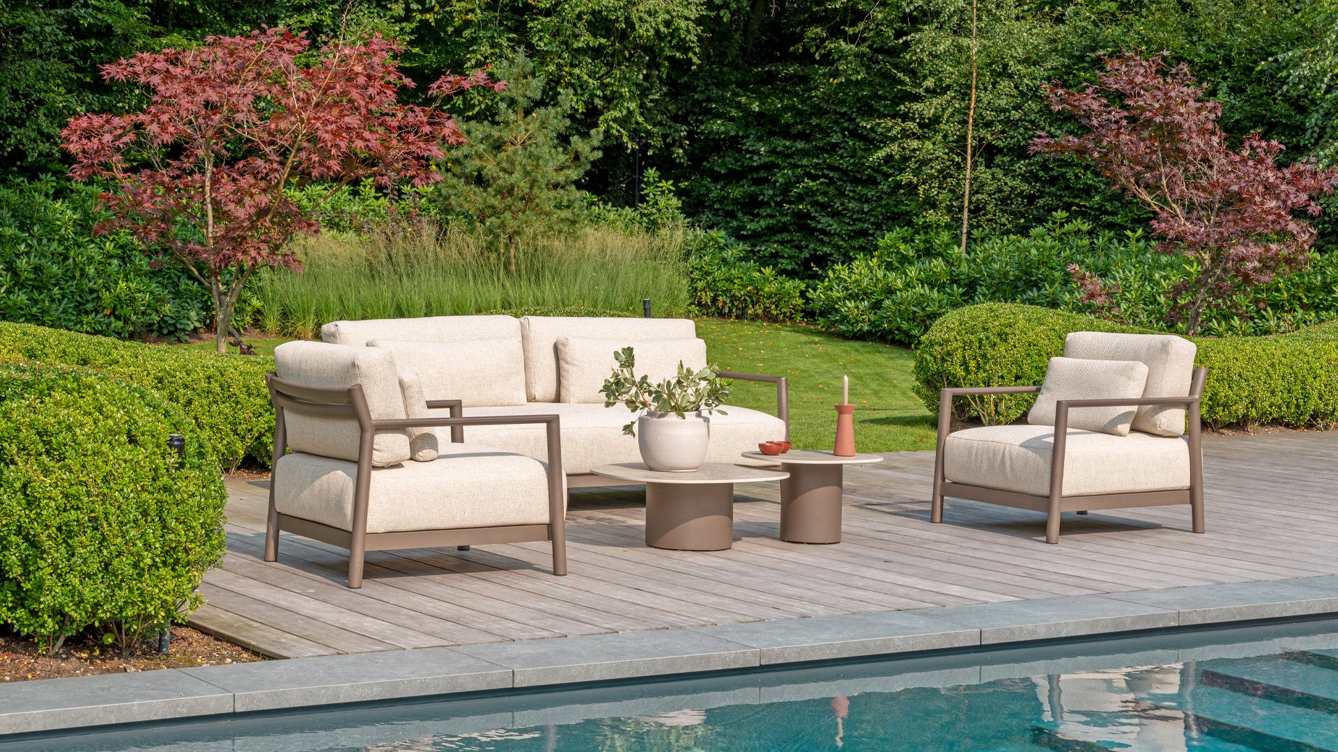 Experience ultimate comfort and stylish simplicity with the Capresi lounge from 4 Seasons Outdoor. This beautiful lounge set, finished in an elegant Terre color, has a simple design that perfectly matches contemporary gardens. The fully aluminum frame is designed with sublime curves, while the thick lounge cushions provide a delightful contrast and optimal comfort.