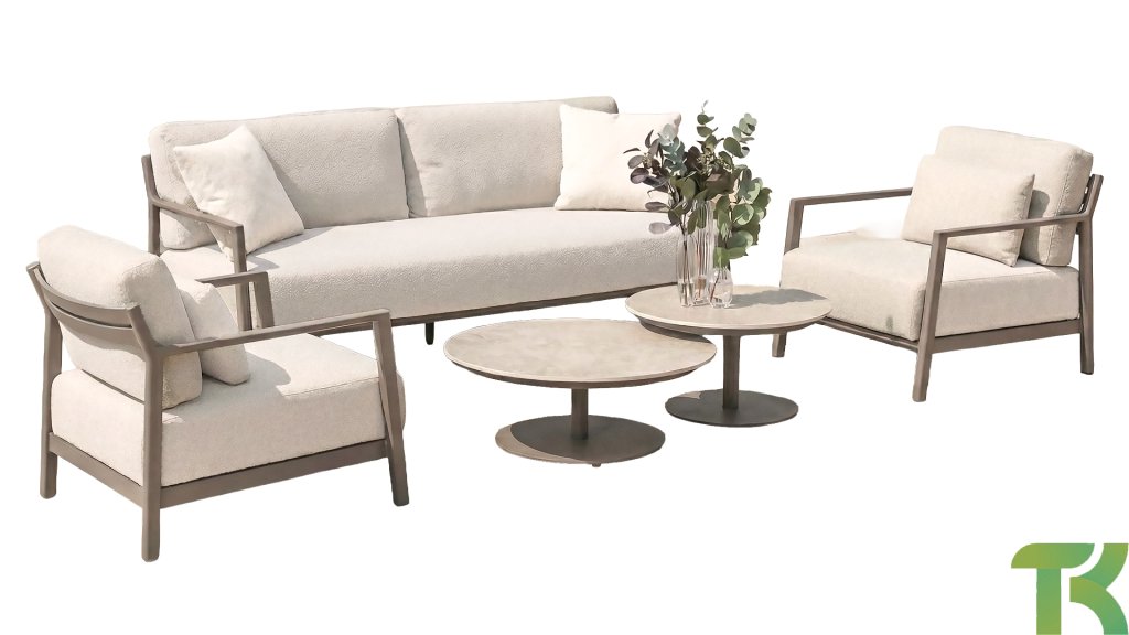 Experience ultimate comfort and stylish simplicity with the Capresi lounge from 4 Seasons Outdoor. This beautiful lounge set, available in an elegant Terra color, features a minimalist design that perfectly complements contemporary gardens. The fully aluminum frame is designed with sublime curves, while the thick lounge cushions provide a delightful contrast and optimal comfort.