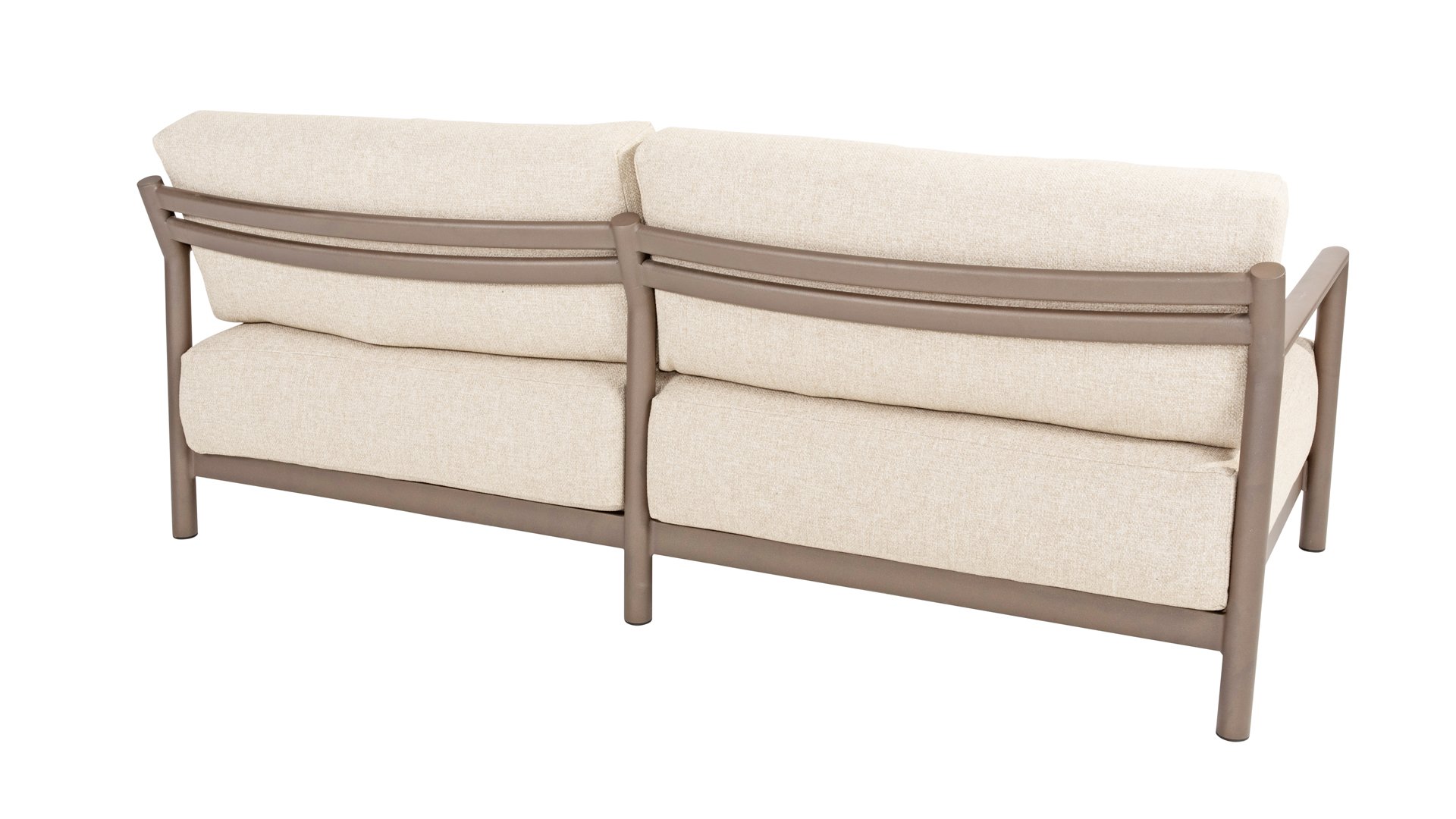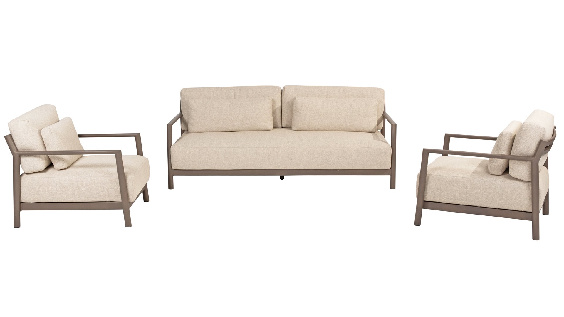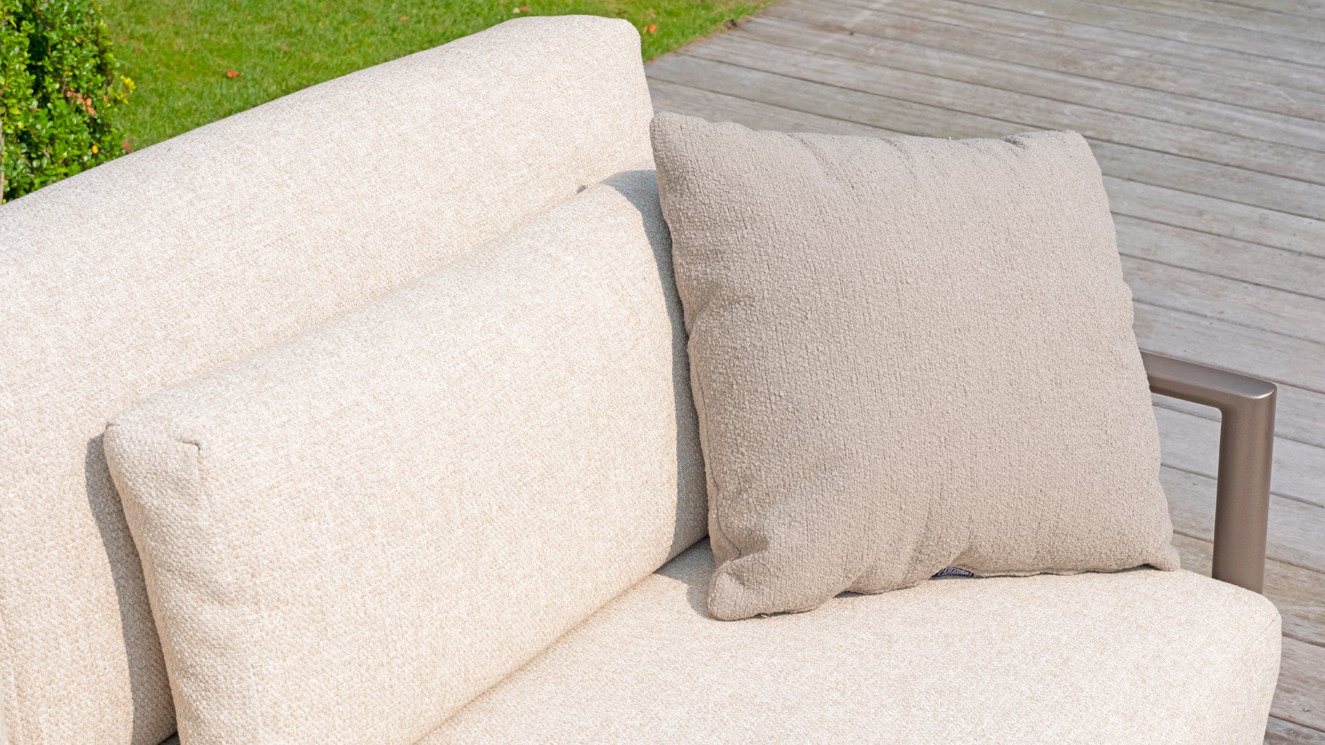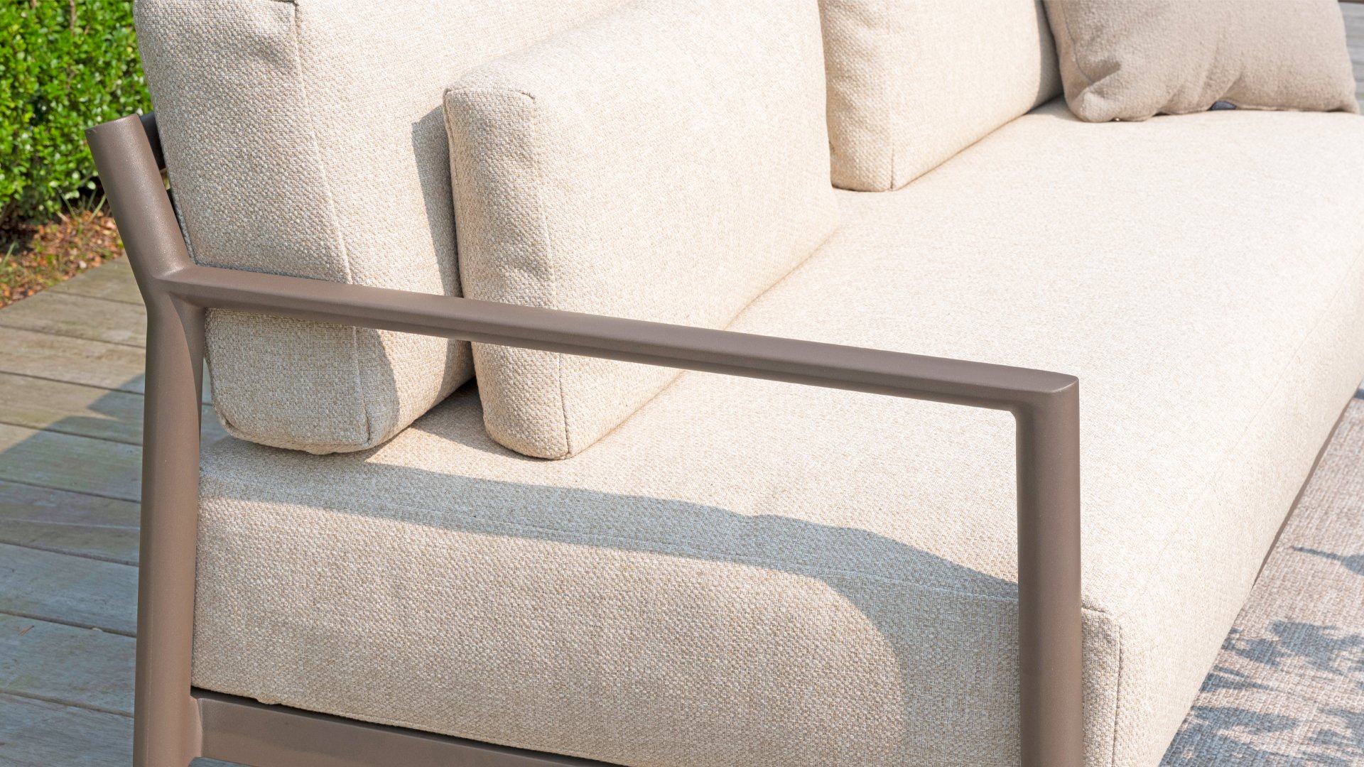 Experience ultimate comfort and stylish simplicity with the Capresi lounge from 4 Seasons Outdoor. This beautiful lounge set, presented in an elegant Terre color, has a minimalist design that perfectly fits contemporary gardens. The fully aluminum frame is designed with sublime curves, while the thick lounge cushions provide a delightful contrast and optimal comfort.