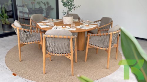 This beautiful material is perfect for outdoor use, because 4SO Rope is not just an shoelace. Our round wires have a synthetic core. This polypropylene base ensures minimal stretching of the rope and also does not absorb moisture. The covering is made of an acrylic fabric, similar to the weather-resistant fabric of our garden cushions. This covering feels soft but is highly water-repellent, UV-resistant, and colorfast. The flat rope variants have the same mix of weather-resistant materials, but the polypropylene material is interwoven with the acrylic fabric. This technique gives the flat rope the same properties but a completely different look. The stretch is minimal, and 4 Seasons Outdoor garden furniture with Rope is suitable for people weighing up to 110 kg. It's therefore an exceptionally strong material, but it's important to be careful with sharp objects. Our Rope is weather-resistant, but a sharp object can seriously damage your garden furniture. We offer exclusive designs using hand-woven Rope patterns and techniques.
