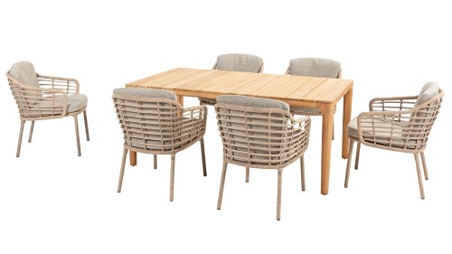 Enjoy timeless retro vibes and natural beauty with the 4 Seasons Outdoor Como dining chair harvest. This chair comes with cushions and features a stylish taupe weaving and a durable aluminum frame. The natural shades and unique 'harvest' weaving give the Como dining chair its character.