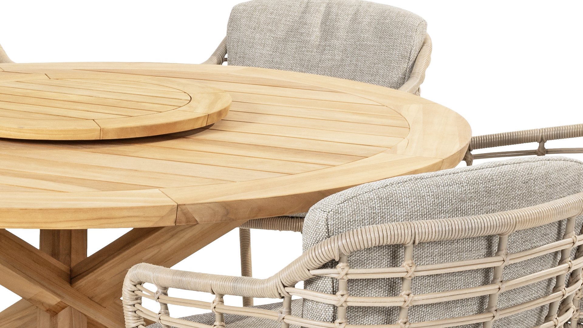 Teak is a natural product and particularly suitable for outdoor use. It is resistant to pests and fungi, and can withstand sun, rain, and snow. Over time, teak develops a silver-grey patina. Teak is a robust material and requires little maintenance. If you prefer the original colour of teak, you can easily prevent it from turning grey by regularly using our care product. Teak can also be cleaned with mild green soap.