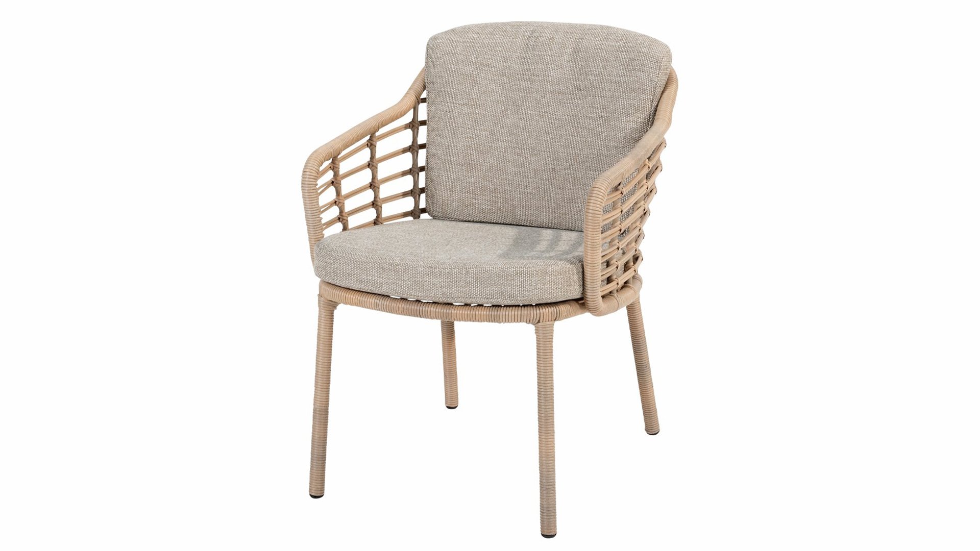 Enjoy timeless retro vibes and natural beauty with the 4 Seasons Outdoor Como dining chair. This chair comes with cushions and features an atmospheric taupe wickerwork and a durable aluminum frame. The natural tones and the unique 'harvest' wickerwork give the Como dining chair its character.