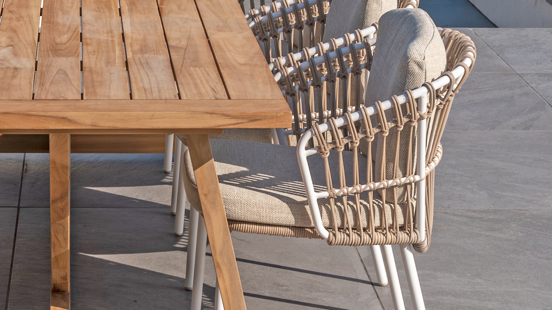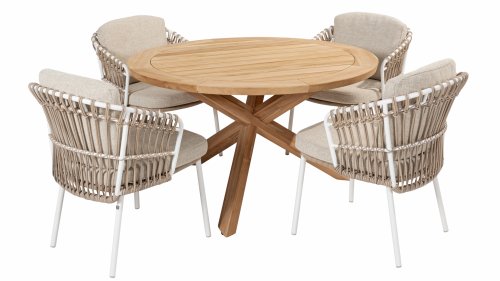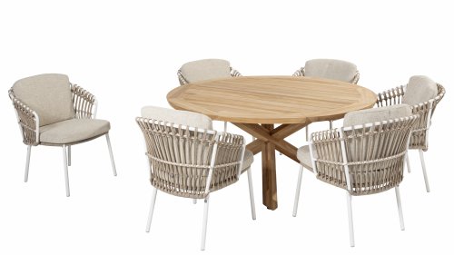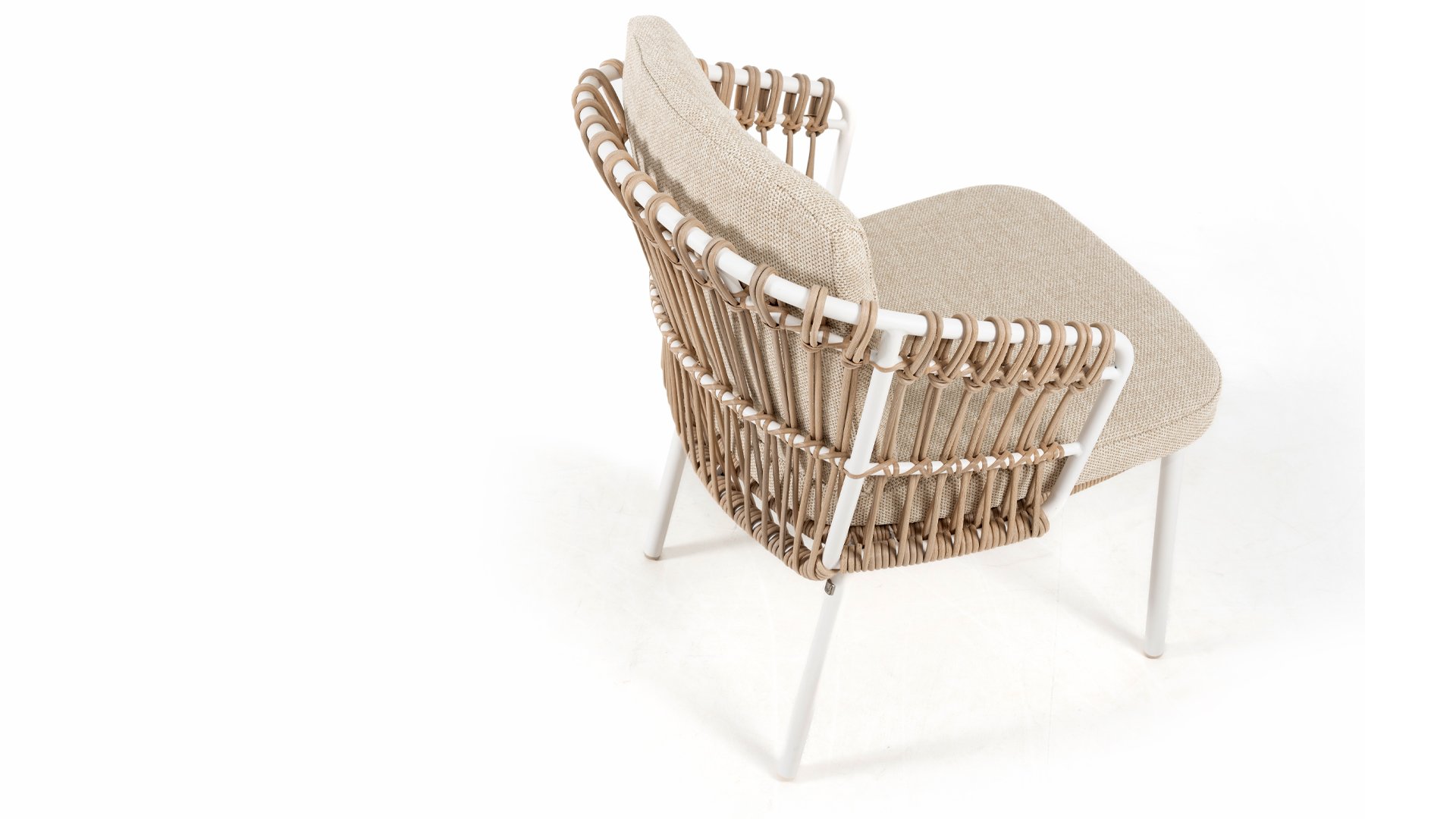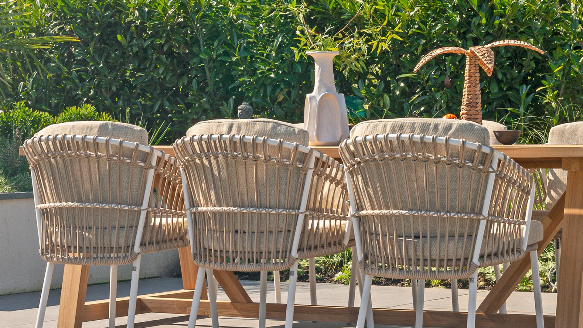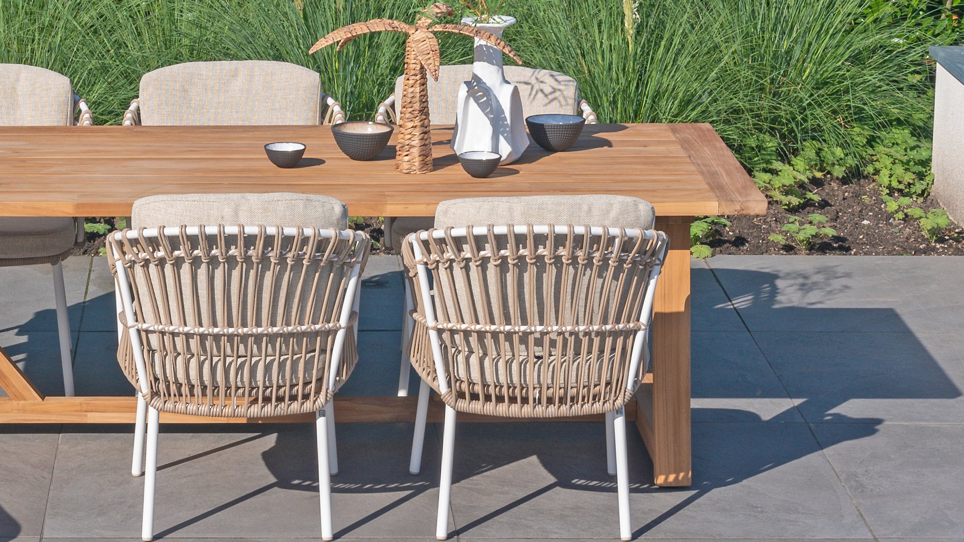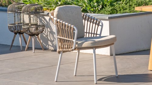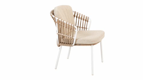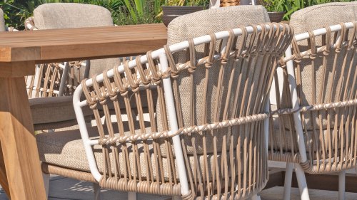 White dahlias on the beach Close your eyes and imagine yourself in Ibiza. The summery atmosphere that the Dalias series exudes with its white frame and taupe braided work instantly gives your garden a sunny boost. If you love summer, then you love Dalias.