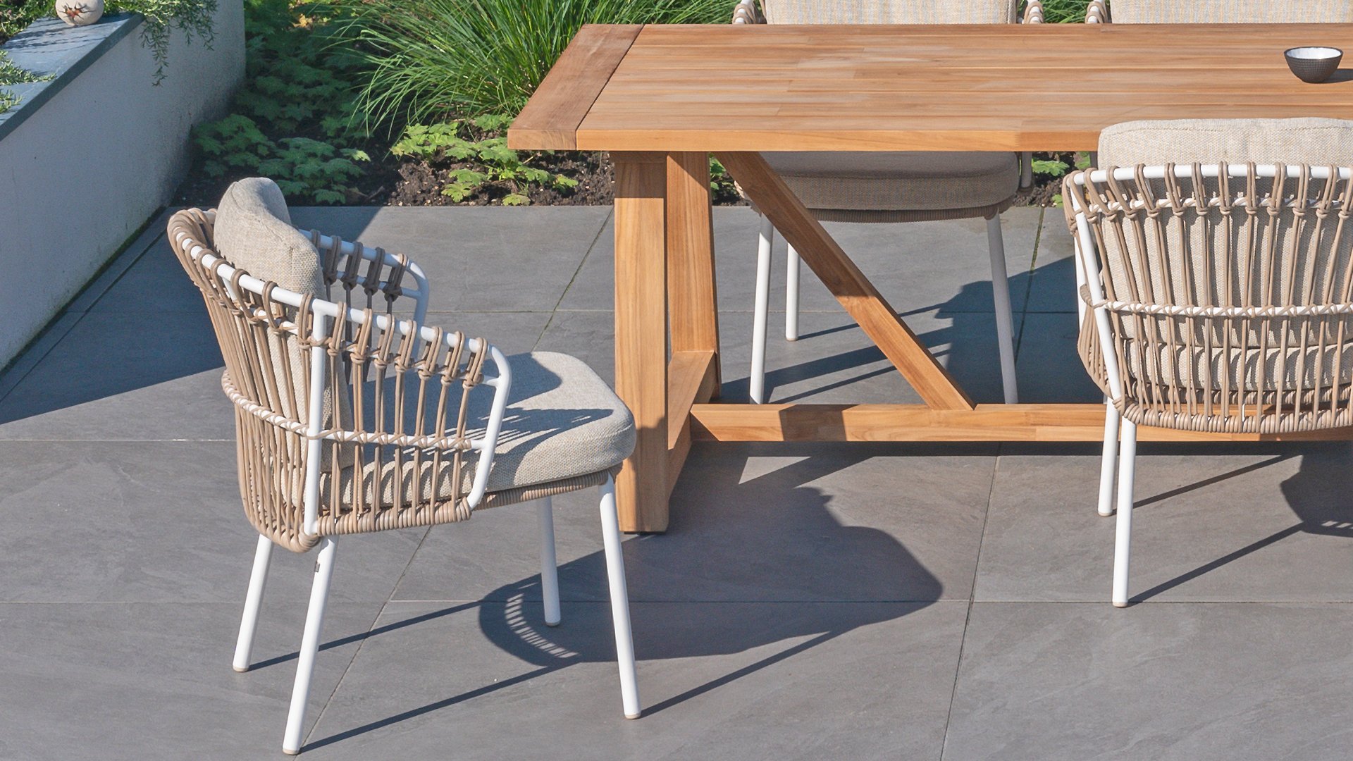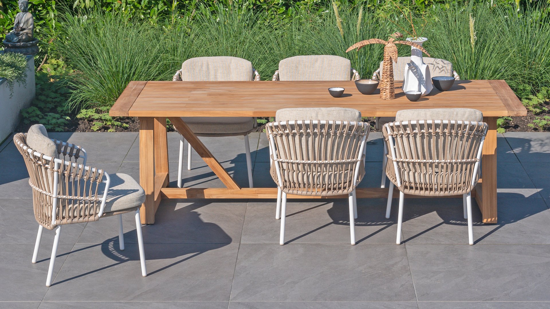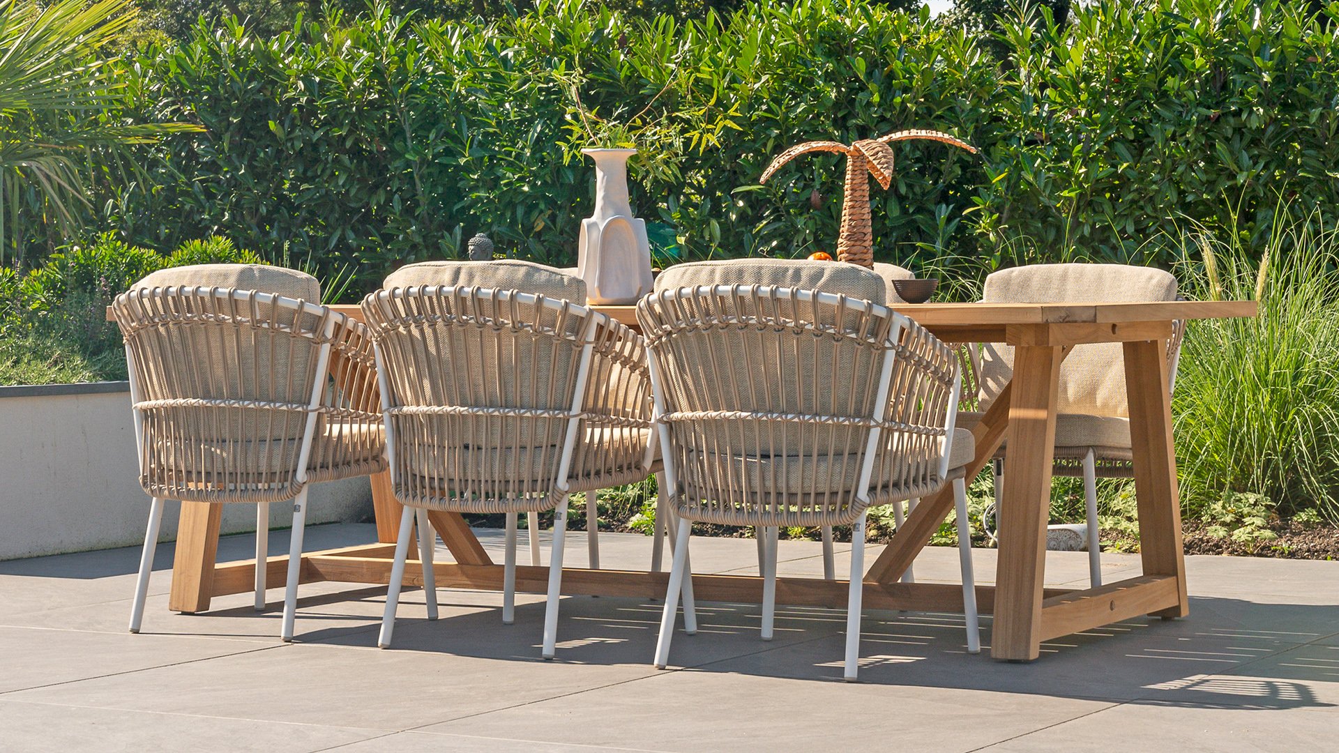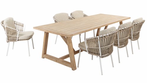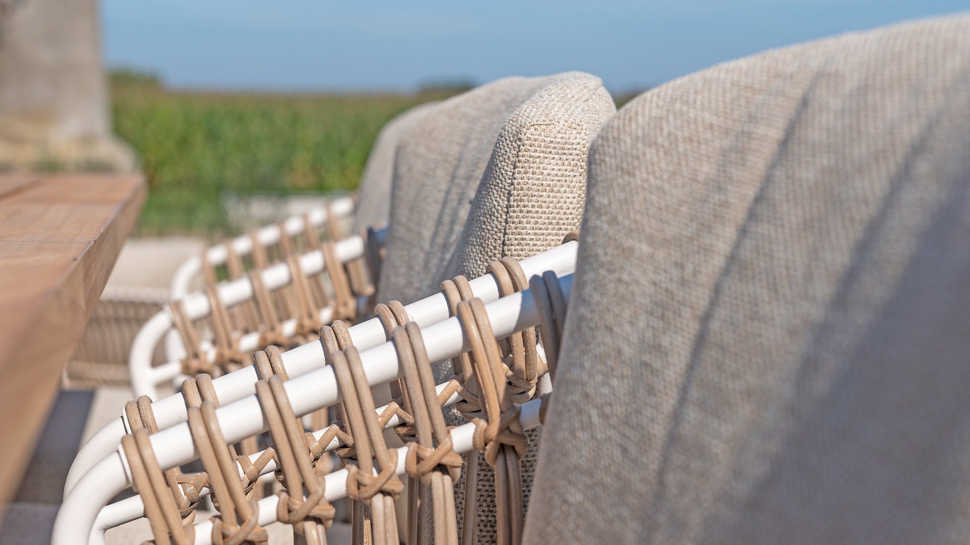 White dahlias on the beach Close your eyes and imagine yourself in Ibiza. The summery atmosphere that the Dalias series exudes with its white frame and taupe braided work instantly gives your garden a sunny boost. If you love summer, then you love Dalias.