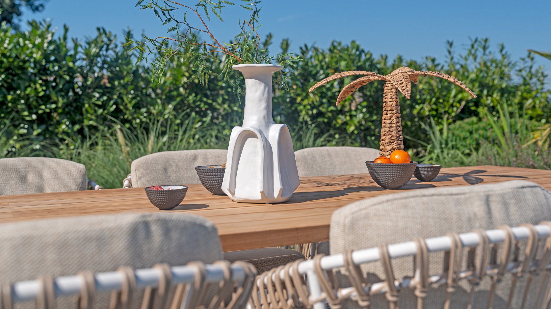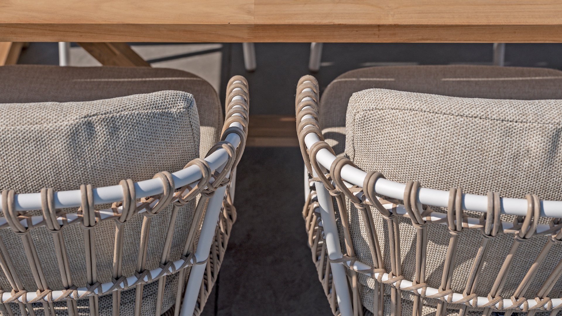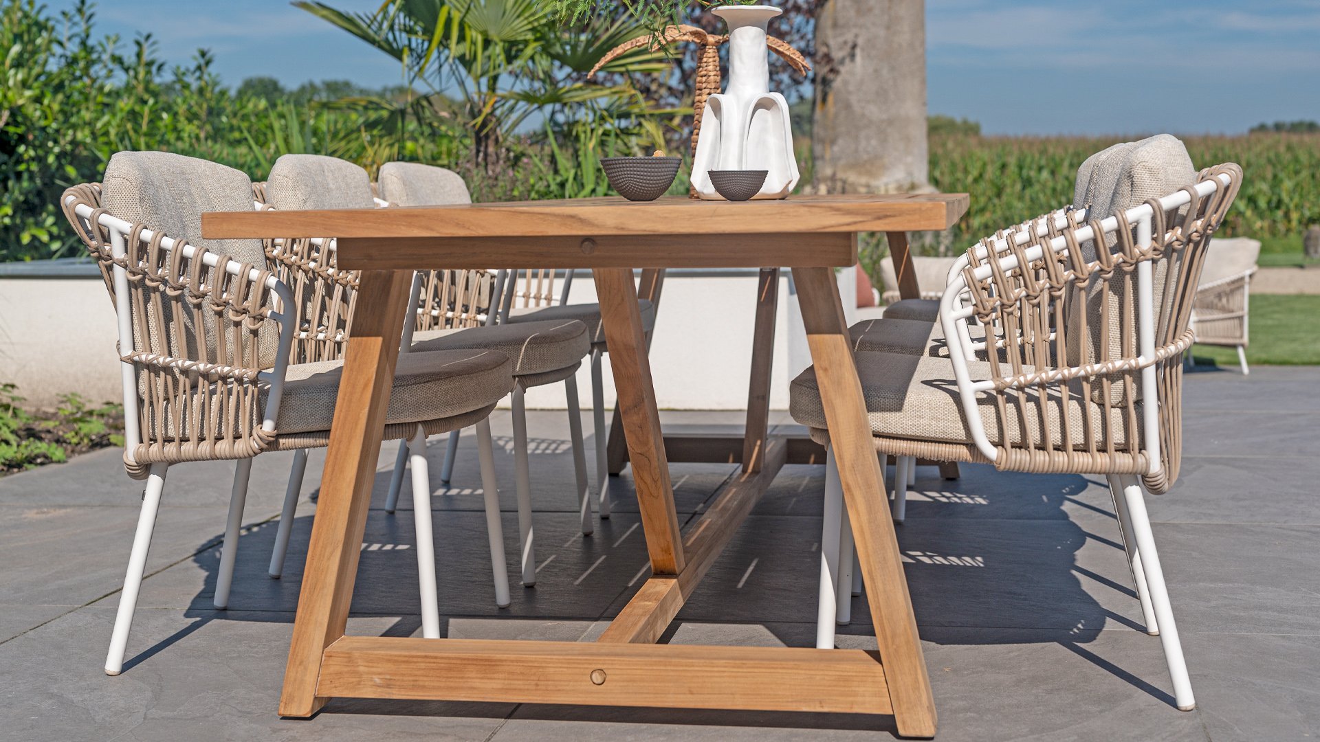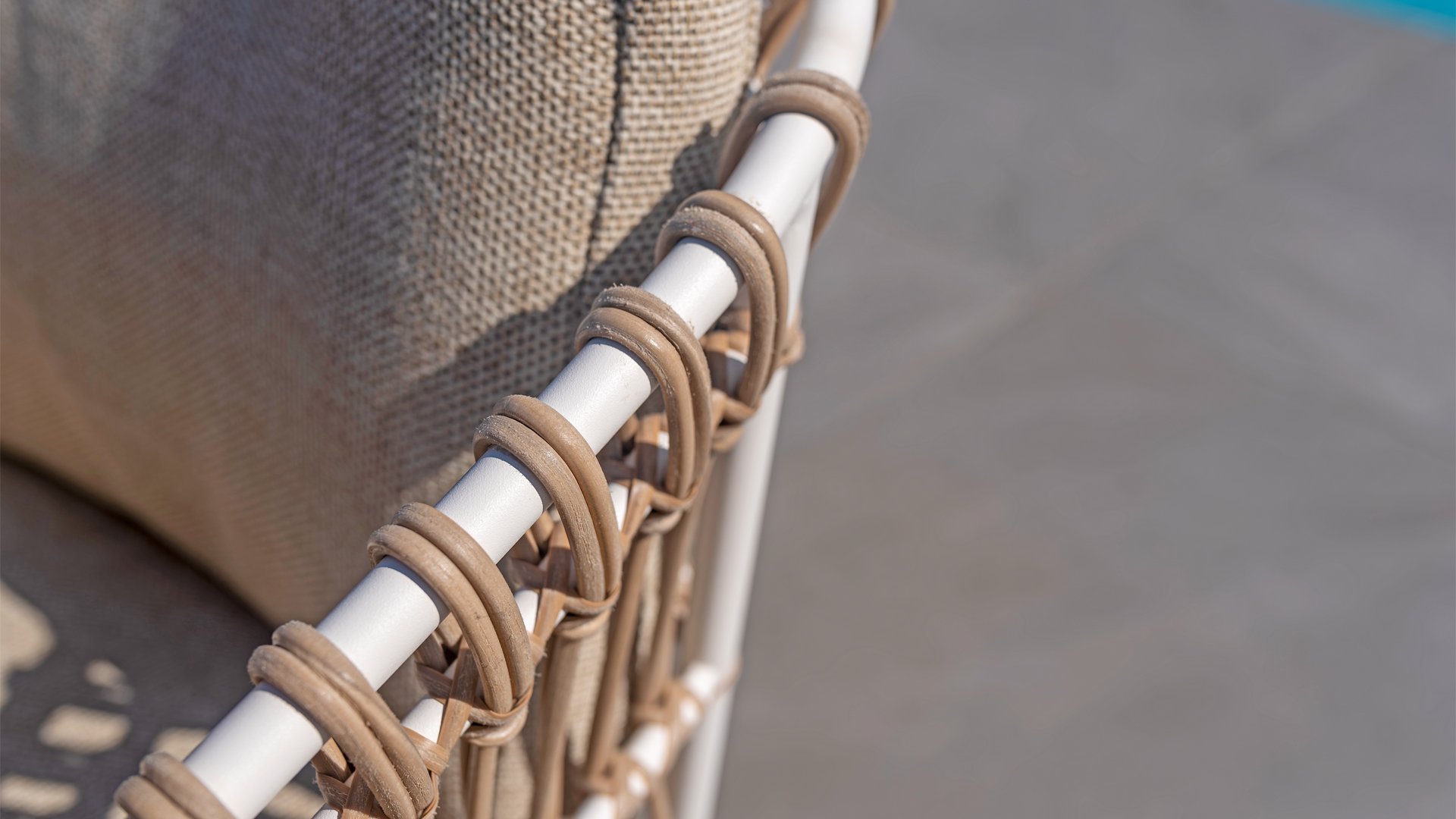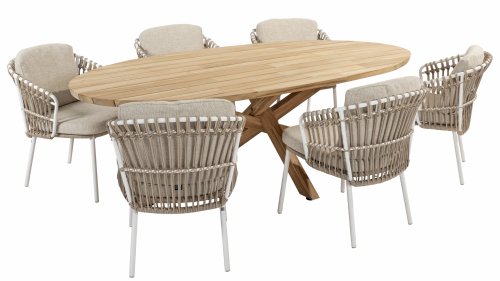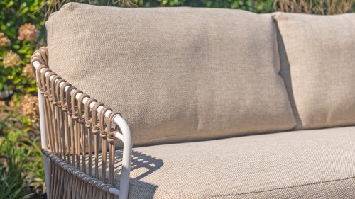 White dahlias on the beach Close your eyes and imagine yourself in Ibiza. The summery atmosphere that the Dalias series exudes with its white frame and taupe braided work instantly gives your garden a sunny boost. If you love summer, then you love Dalias.